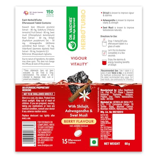 • Contains Richness of 6 Natural Ingredients - Dr. Vaidya's Herbo24Turbo Effervescent contains science-backed ingredients such as Shilajit Ashwagandha and Safed Musli for enhanced performance and strength