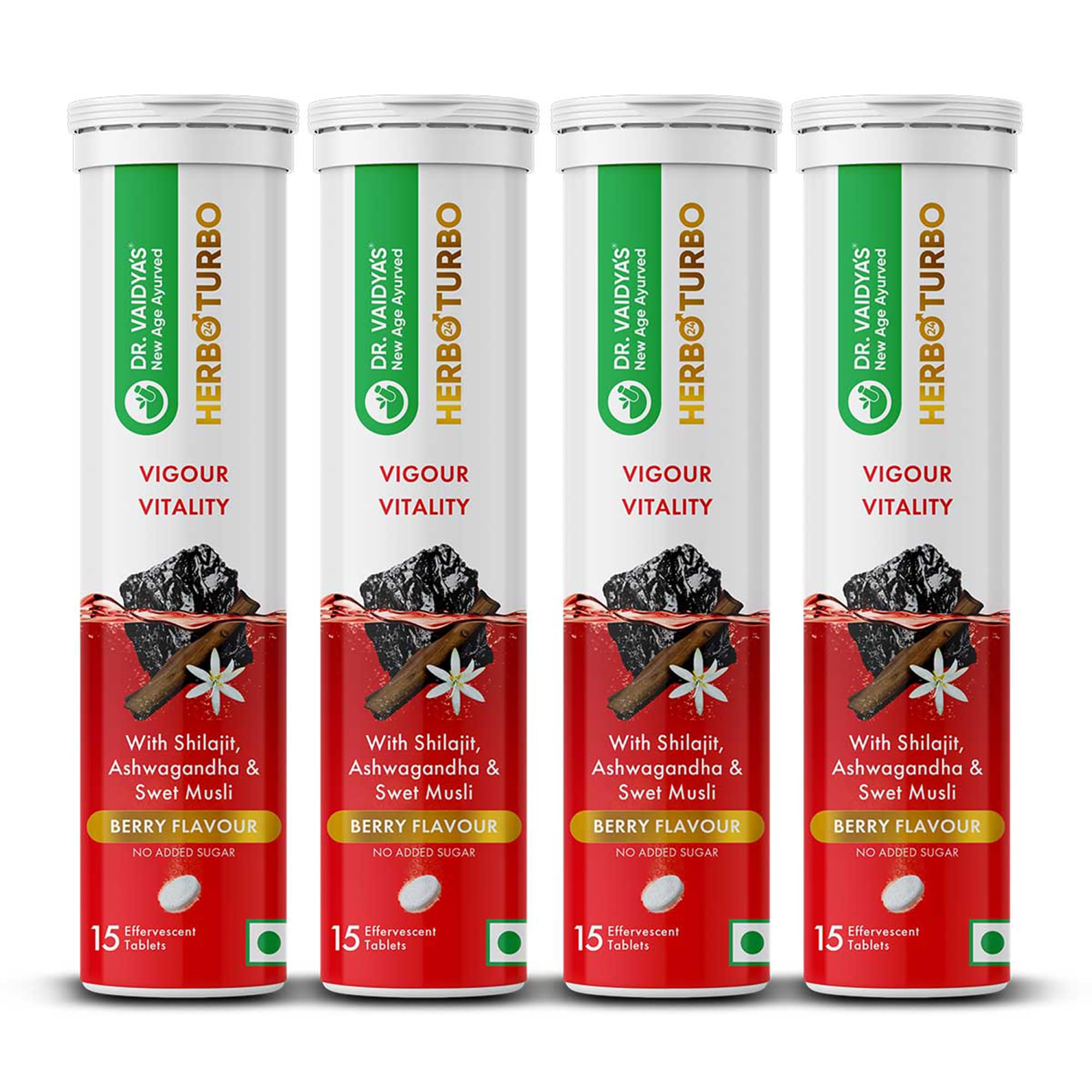 Dr. Vaidya's Herbo24Turbo Effervescent: Unlock Super Vigour and Vitality with Shilajit and Ashwagandha(Berry Flavour)(Pack of 4)