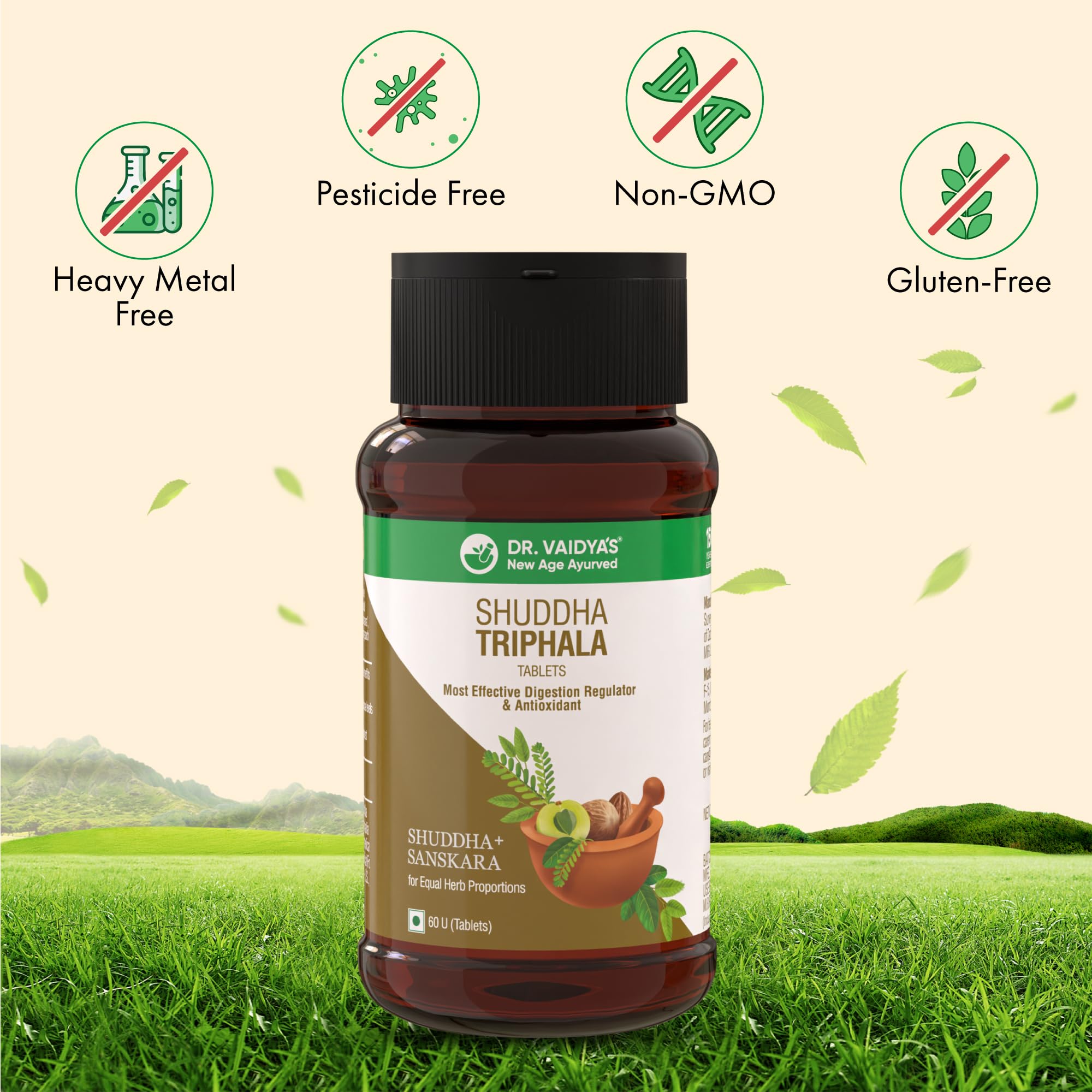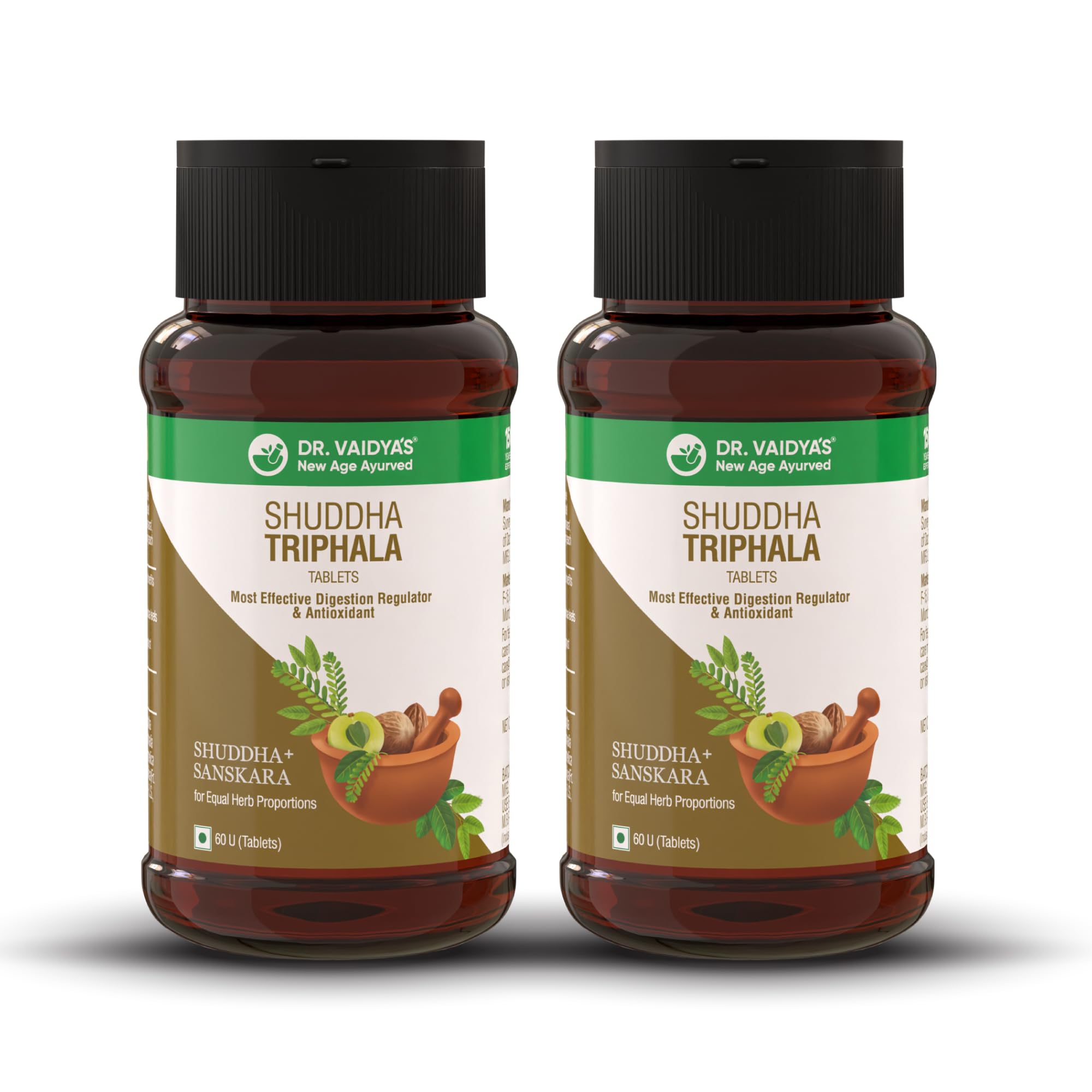 Dr. Vaidya's Shuddha Triphala Tablets | 3-Step Sanskara Process for Maximum Potency | with Digestion Regulator & Antioxidant | Regularise Gut Health | (60 Tablets) Pack of 2