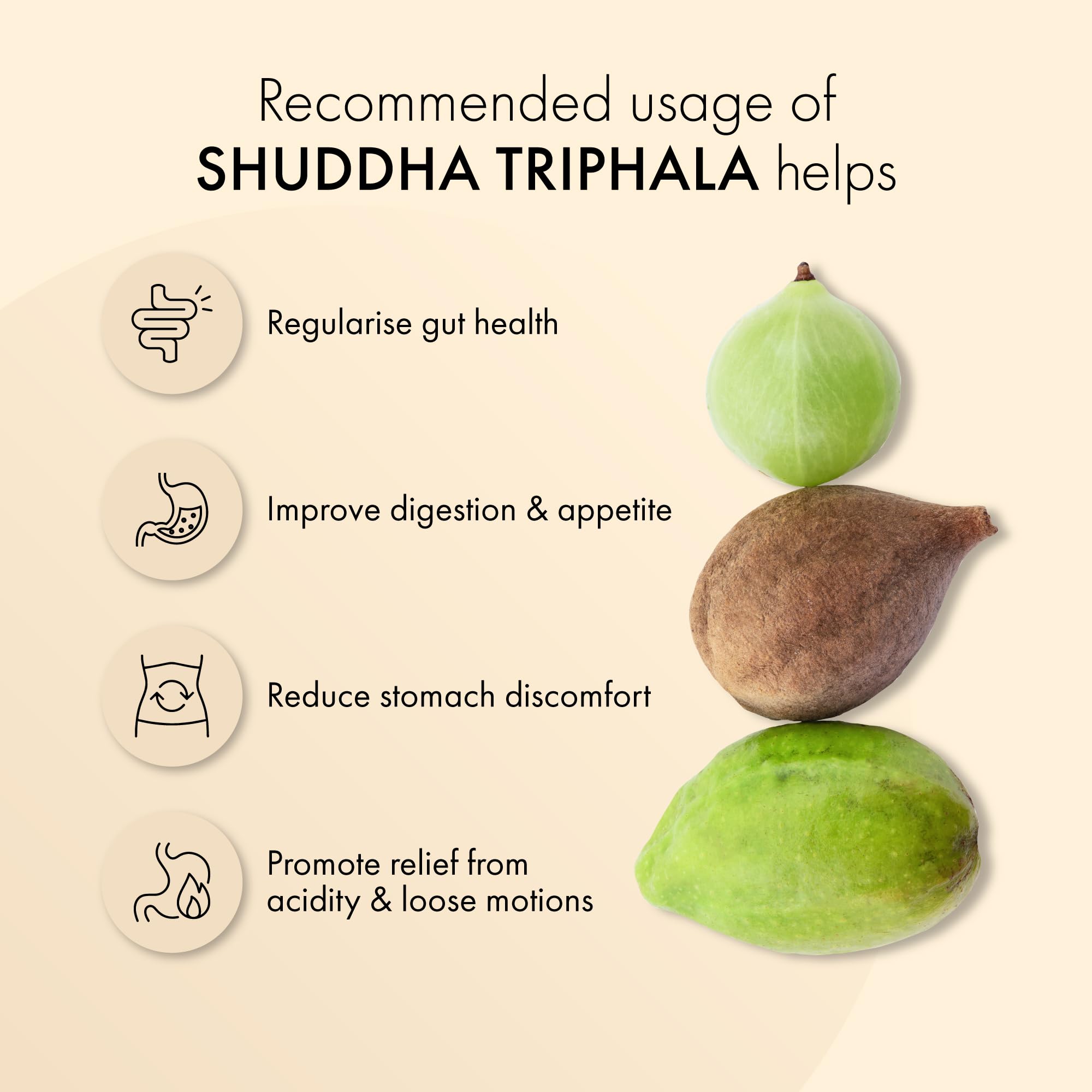 • 3-STEP SANSKARA PROCESS: Our scientists follow a meticulous 3-step Sanskara process ensuring the highest quality and optimal effects of Shuddha Triphala. It includes sourcing excellence restoration of essential elements and micronization for optimal absor