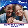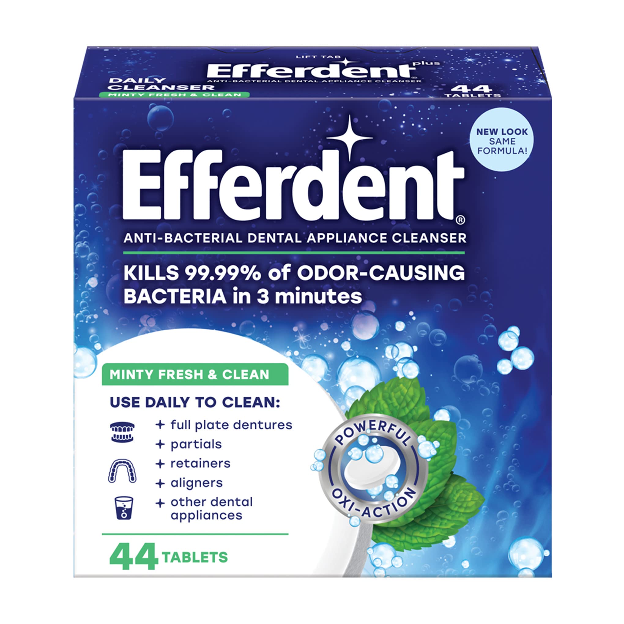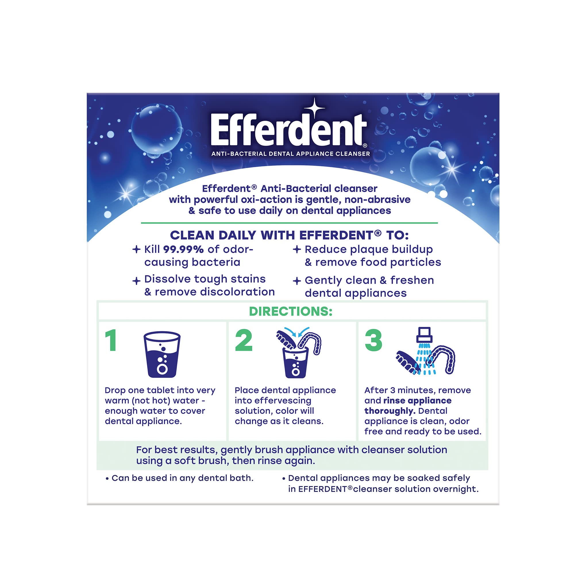 You'll smile with confidence knowing that your teeth and gums are clean bright and healthy. Efferdent Minty Fresh & Clean antibacterial cleaner tablets cleanse dental appliances while giving them a minty fresh flavor. Efferdents Oxi-Action cleaning tablets give a complete clean by eliminating the most stubborn stains in hard-to-reach places. The effervescent cleaning action reduces plaque buildup and brightens retainers dentures and aligners. It also removes food particles that can cause gum irritation so your mouth will feel just as good as it looks. Efferdent Minty Fresh & Clean retainer cleaner tablets kill 99.99% of odor-causing bacteria in 3 minutes; while being gentle non-abrasive and safe to use daily. Efferdent cleans full plate dentures partials retainers aligners and other dental appliances. The cleaner tablets can be used in any dental bath. To use drop one Minty Fresh & Clean tablet into very warm water enough water to cover the dental appliance. Then place the appliance into the effervescing solution which will change color as it cleans. After 3 minutes remove and rinse dental appliance thoroughly. For best results gently brush the appliance with the cleanser solution using a soft brush then rinse again. Efferdent gives a variety of cleaning types: Complete Clean Essential Clean Minty Fresh & Clean and Overnight Clean. Efferdent is the first denture and retainer cleaning tablet brand accepted by the American Dental Association. No wonder dental appliance wearers feel confident when they use Efferdent Dental Appliance Cleansers.