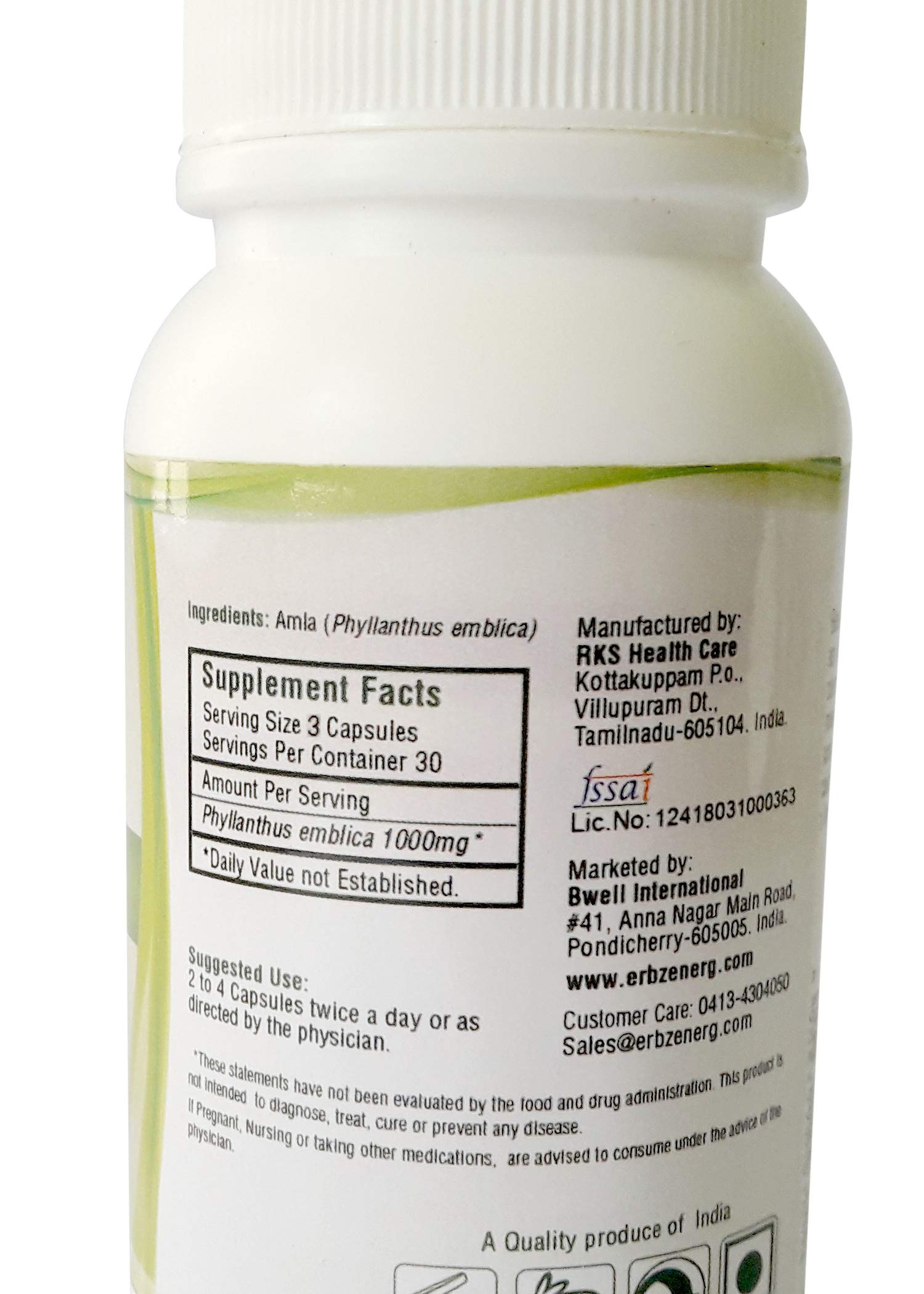 ERBZENERG Amla Capsules (500 MG each). Being a rich source of Vitamin C this can possess several health benefits. The Amla Capsule is a bio-available source of natural Vitamin C that is easily digested and assimilated from one of nature's prime sources of Vitamin C the whole Amla fruit. It contains 20 times more vitamin C than oranges. It is also rich in proteins and fibres. It contains minerals such as Iron Calcium and Phosphorous besides Vitamin A.