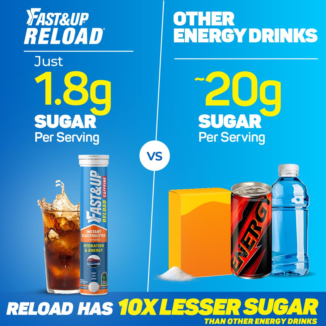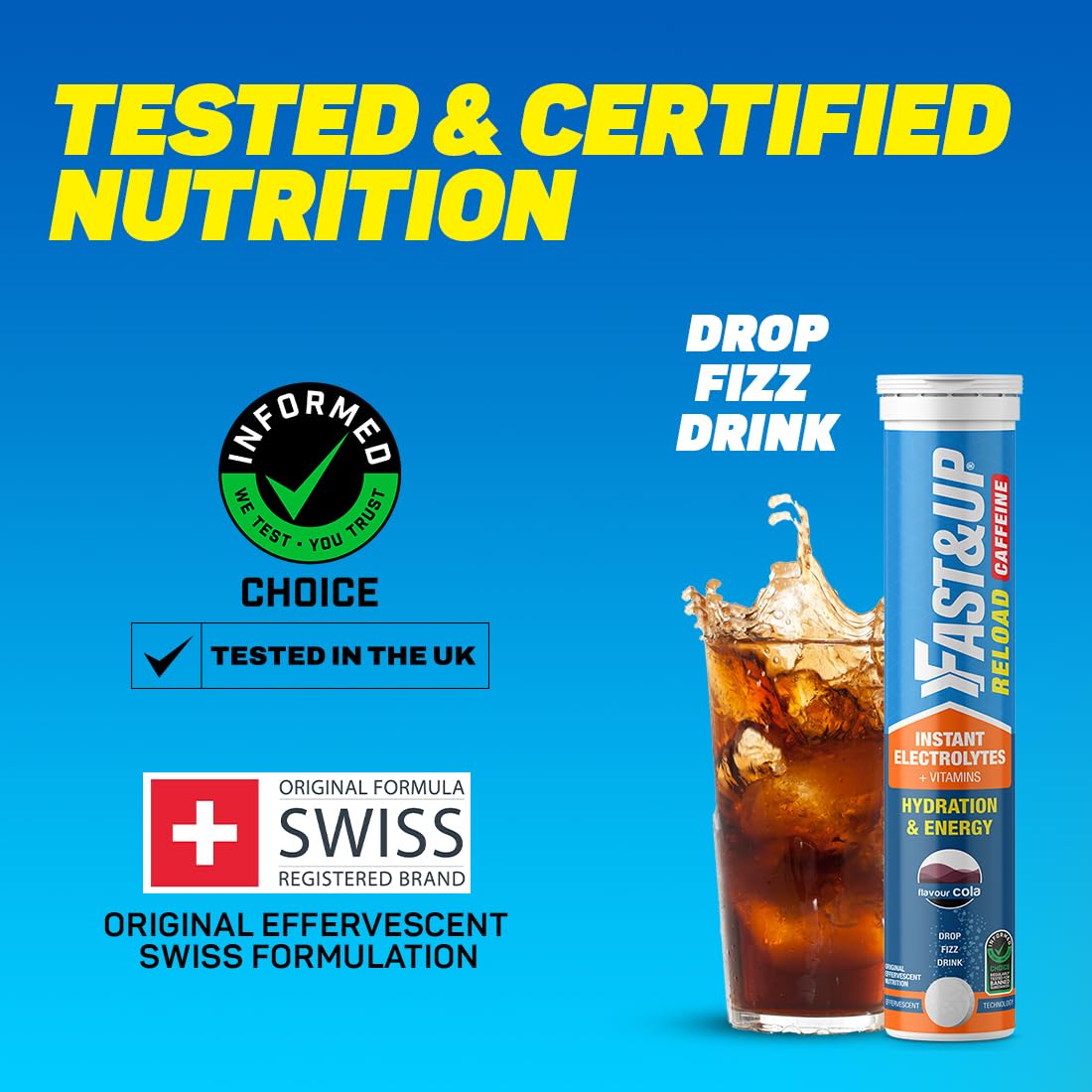 Fast&Up Reload Electrolytes with Added Caffeine Energy Drink and Instant Hydration Sports Drink - 20 Effervescent Tablets - Cola Flavour