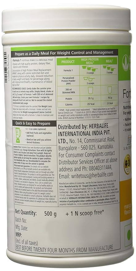 Formula 1 nutritional shake mix 500g gives you a fair advantage about the weight loss program which you've targeted. Get your own shape by using Herbalife protein shake mix usage - simply beat, stir or shake approximately 25 grams(approximately 3 tablespoons") formula 1 with 250ml of water, skimmed milk or juice as per your choice + add 1 tablespoon of formula 3 ( personalized protein powder ) and enjoy your Herbalife shake.