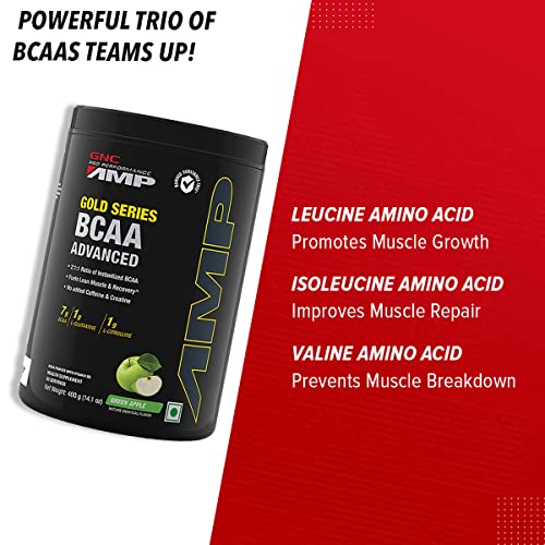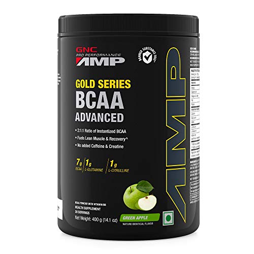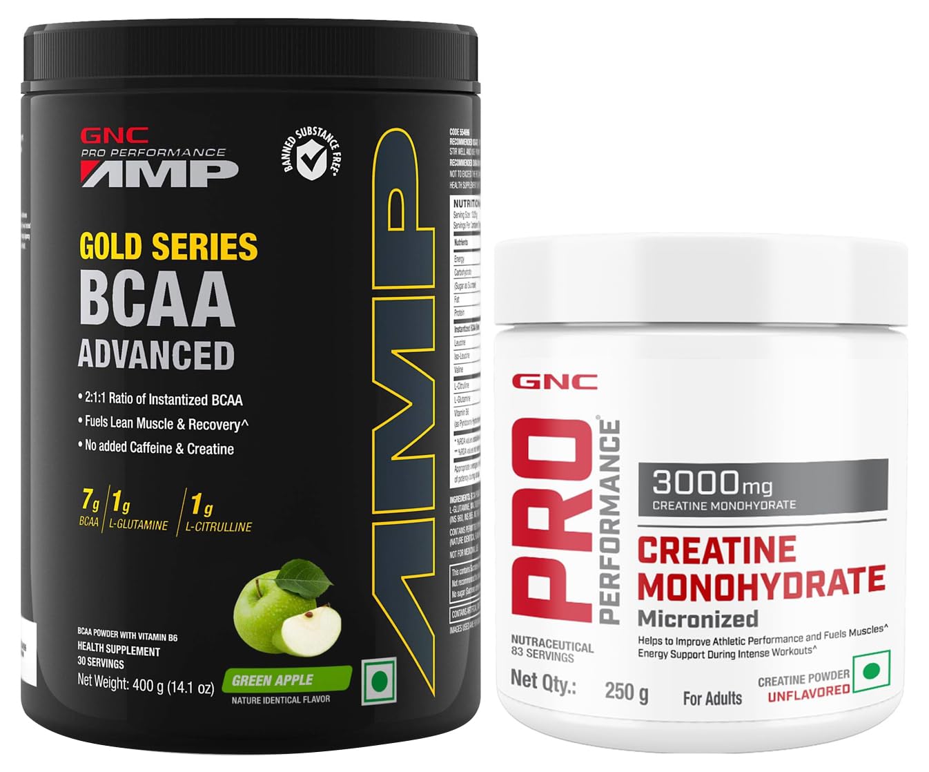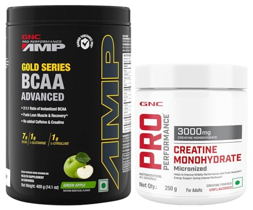 GNC AMP Gold Series BCAA Advanced powder| Fastest Muscle Recovery | Maximized Workout Performance | Formulated In USA | 7g BCAA | 1g L-Glutamine | 1g L-Citrulline | Green Apple | 400 gmTrigger your beast mode ON with GNC AMP Gold Series BCAA Advanced supplement . It features 2:1:1 ratio of instantized BCAAs including 3.5gms Leucine 1.75gms Isoleucine and 1.75gms Valine which effectively helps build lean muscles and boost immunity. This BCAA powder contains 1gm of L-Glutamine to alleviate muscle fatigue and promote faster post-workout recovery. Plus it has 1gm of L-Citrulline that improves blood flow in muscles getting you ready for a heavy fitness session. GNC's BCAA supplement for men includes Vitamin B6 to make up for its loss during intense workouts. GNC's BCAA supplement has zero Caffeine and Creatine preventing dehydration or digestion discomfort. It comes in a delicious quirky flavor that makes each sip super enjoyable. Plus the formula contains zero added sugar for keeping up with your health goals. GNC's BCAA powder is World Anti-Doping Agency (WADA) approved and Informed Choice certified.GNC Pro Performance Creatine Monohydrate (Unflavoured 250 gm Powder) Boosts Athletic Performance | Micronized Fuels Muscles | Provides Energy Support for Heavy Workout | Formulated In USAGet your performance curve up and rising with the GNC Pro Performance Creatine Monohydrate . It gets converted to Creatine Phosphate in the body to fuel skeletal muscles and enhance your exercise capacity. Moreover GNC's creatine supplement promotes faster energy production to energize you during heavy workout sessions. It improves your athletic performance and stamina remarkably. This formula hydrates your muscle cells to volumize your muscles and give them a hulking appearance. GNC's creatine powder is micronized and instantized to enable faster absorption in your body and get you energy-ready for the upcoming workout. In addition to athlete-centric benefits this creatine supplement also supports your nervous system and helps regulate your blood sugar. It is completely devoid of gluten sugar soy dairy and some artificial ingredients to suit your lifestyle preferences. GNC's creatine is unflavoured so you can mix it into your favorite drink without changing the taste.