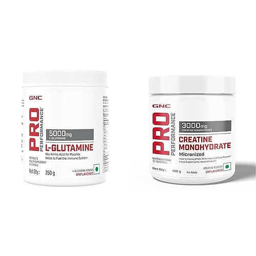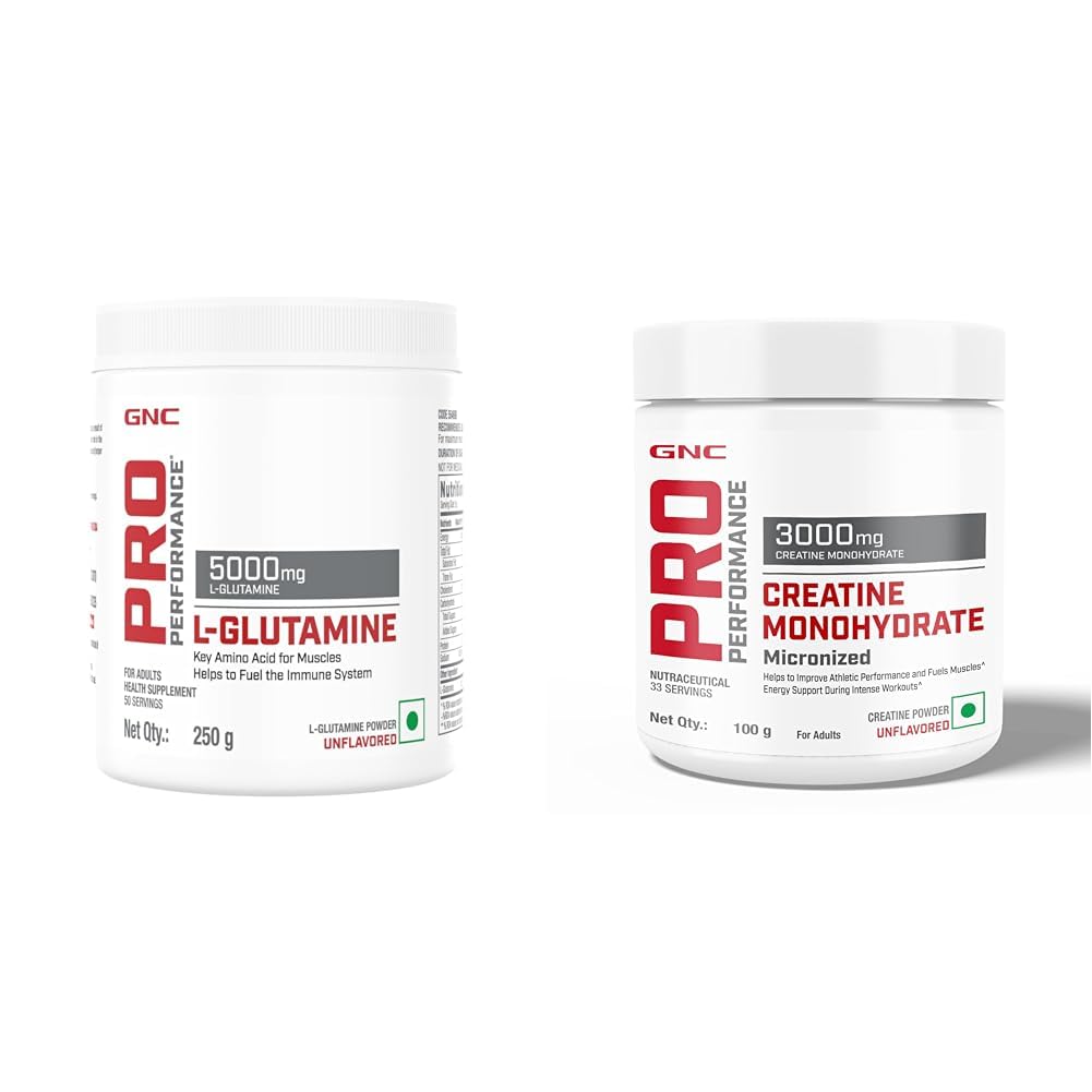 GNC Pro Performance L-Glutamine 5000 mg | 250 gm | 50 Servings | Key Amino Acid For Faster Recovery | Boosts Immunity | Supports Intestinal Function | Lactose Free | Zero Gluten | UnflavouredGlutamine [gloo-tuh-meen] a non-essential amino acid is one of the most abundant amino acids found in muscles. It plays an important role in muscle function during and after exercise. Each serving of GNC L-Glutamine powder supplies 5000mg of L-Glutamine and blends easily with and beverage or sports drinks. It serves as fuel for the immune system and maintenance of proper intestinal function. Pro Performance L-Glutamin is tested and certified Banned Substance Free. GNC L-Glutamine powder is gluten and lactose-free.GNC Pro Performance Creatine Monohydrate | 100 gm | 33 Servings | Boosts Athletic Performance | Micronized & Instantized | Fuels Muscles | Provides Energy Support for Heavy Workout | UnflavouredGet your performance curve up and rising with the GNC Pro Performance Creatine Monohydrate . It gets converted to Creatine Phosphate in the body to fuel skeletal muscles and enhance your exercise capacity. Moreover GNC's creatine supplement promotes faster energy production to energize you during heavy workout sessions. It improves your athletic performance and stamina remarkably. This formula hydrates your muscle cells to volumize your muscles and give them a hulking appearance. GNC's creatine powder is micronized and instantized to enable faster absorption in your body and get you energy-ready for the upcoming workout. In addition to athlete-centric benefits this creatine supplement also supports your nervous system and helps regulate your blood sugar. It is completely devoid of gluten sugar soy dairy and some artificial ingredients to suit your lifestyle preferences. GNC's creatine is unflavoured so you can mix it into your favorite drink without changing the taste.
