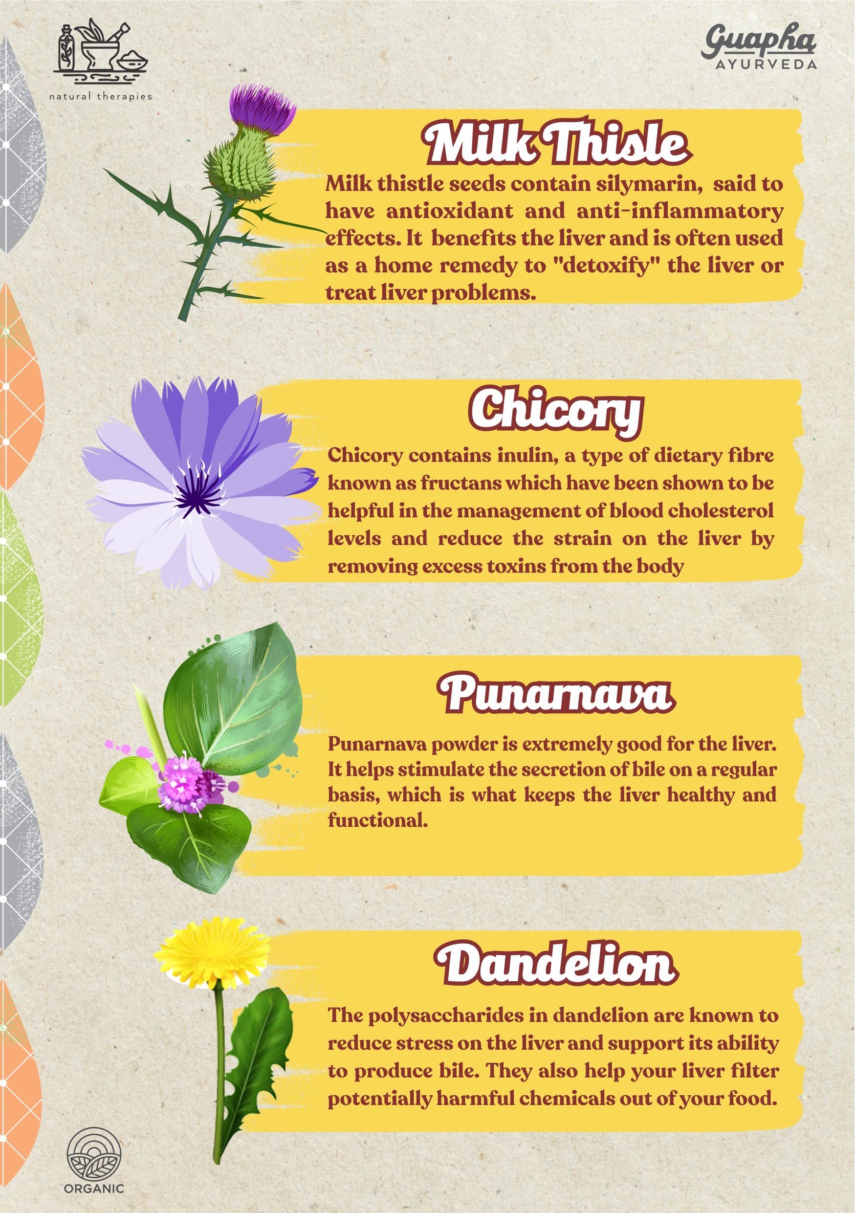 GUAPHA AYURVEDA LIVER WELLNESS: Guapha Ayurveda Liver Wellness Detox is a plant-based science-backed holistic liver care. Powered with the goodness of nano-formulated Milk Thistle Dandelion & Chicory extracts. The best of science infuses the natural goodn