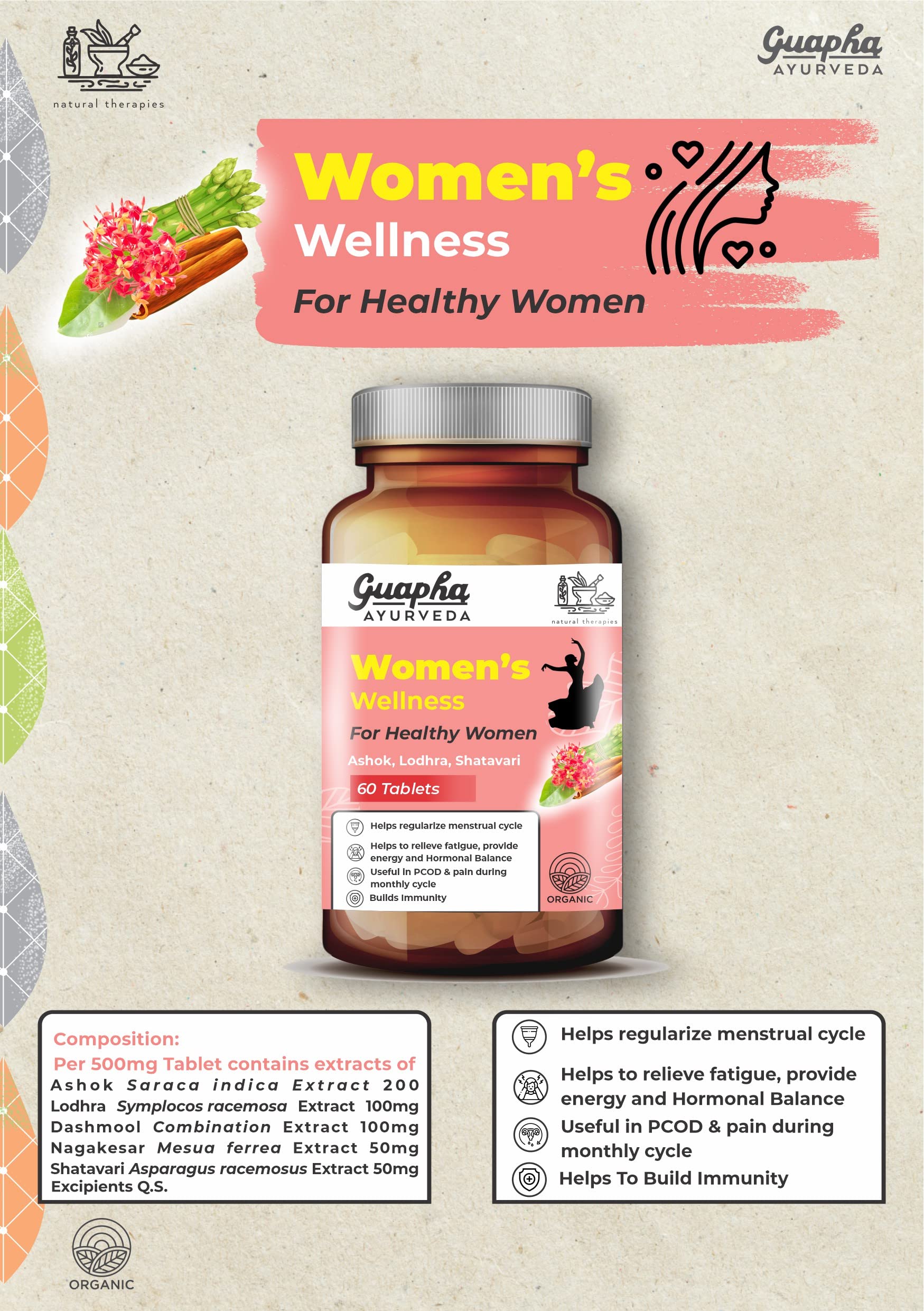 Guapha Ayurveda Women's Wellness | For Healthy Women | With Herbal Extracts Of Ashok Lodhra Shatavari 60 Tablets |