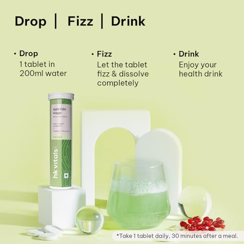Sparkling health in a tablet- the fizzlicious way to consume apple cider vinegar! HealthKart HK Vitals Apple Cider Vinegar is Indiaâs first 750 mg apple cider vinegar tablet which is effervescent; Available in tasty green apple & watermelon flavours. HK Vitals Apple Cider Vinegar promotes weight management by keeping you full for longer. Apple cider vinegar tablet has natural acidic properties that help balance stomach acids reducing bloating and gas and improving digestion. Apple Cider Vinegar contains acetic acid which increases the activity of enzymes that improve our metabolism so our body burns calories faster. Apple Cider Vinegar is also enriched with Vitamin B6 & B12 to help fat mobilization & energy production while pomegranate extract helps boost immunity. It has no added sugar or preservatives & is 100% vegetarian. Get HealthKart HK Vitals ProteinUp Shaker Bottle of 600 ml capacity for easy mixability with apple cider vinegar effervescent tablets. To minimise messy spills it has a wide-mouth bottle cap that is secured with a tight screw on top