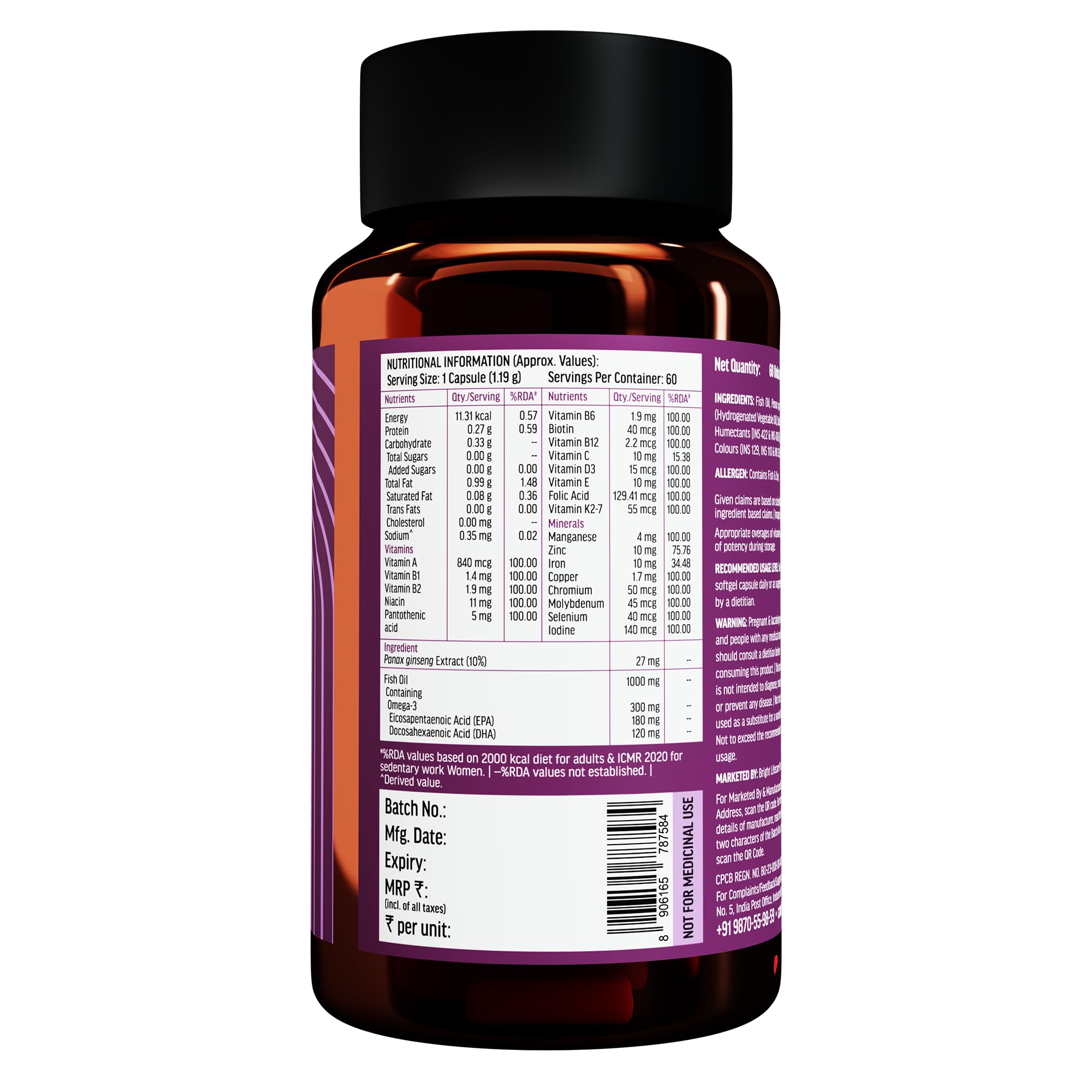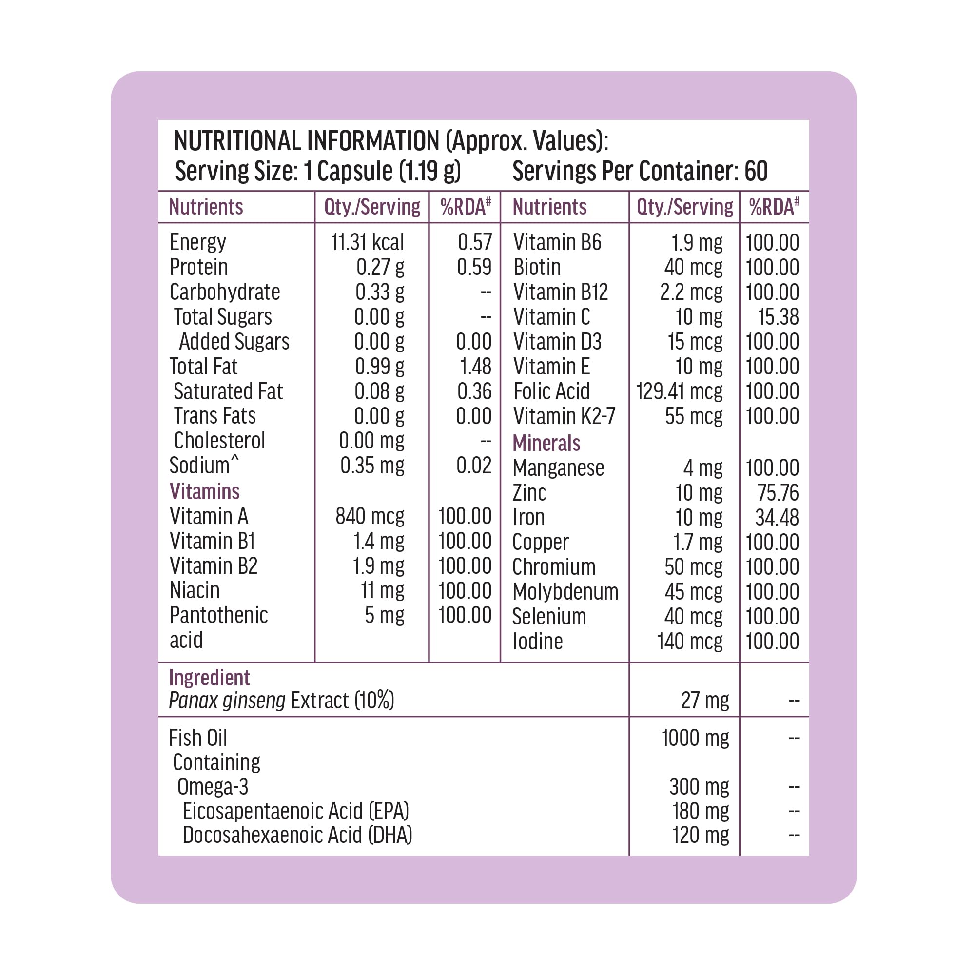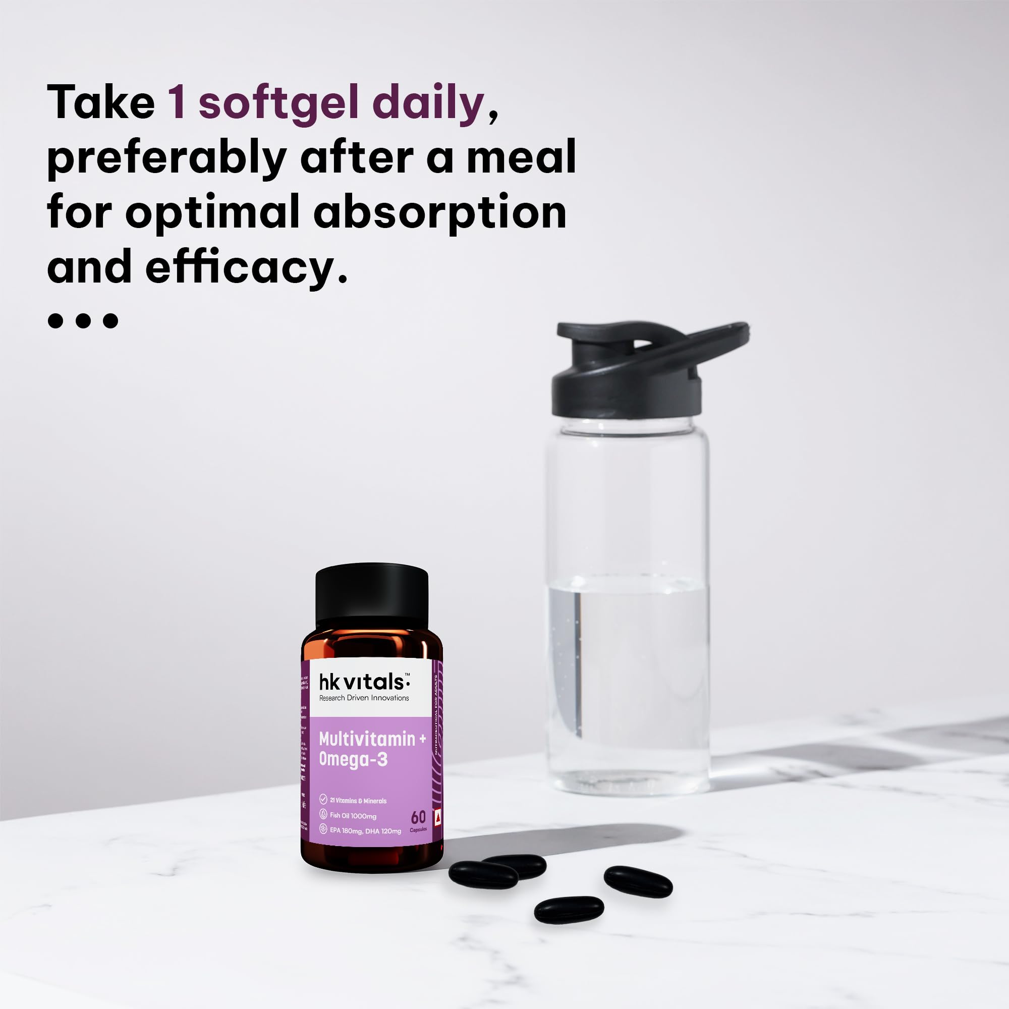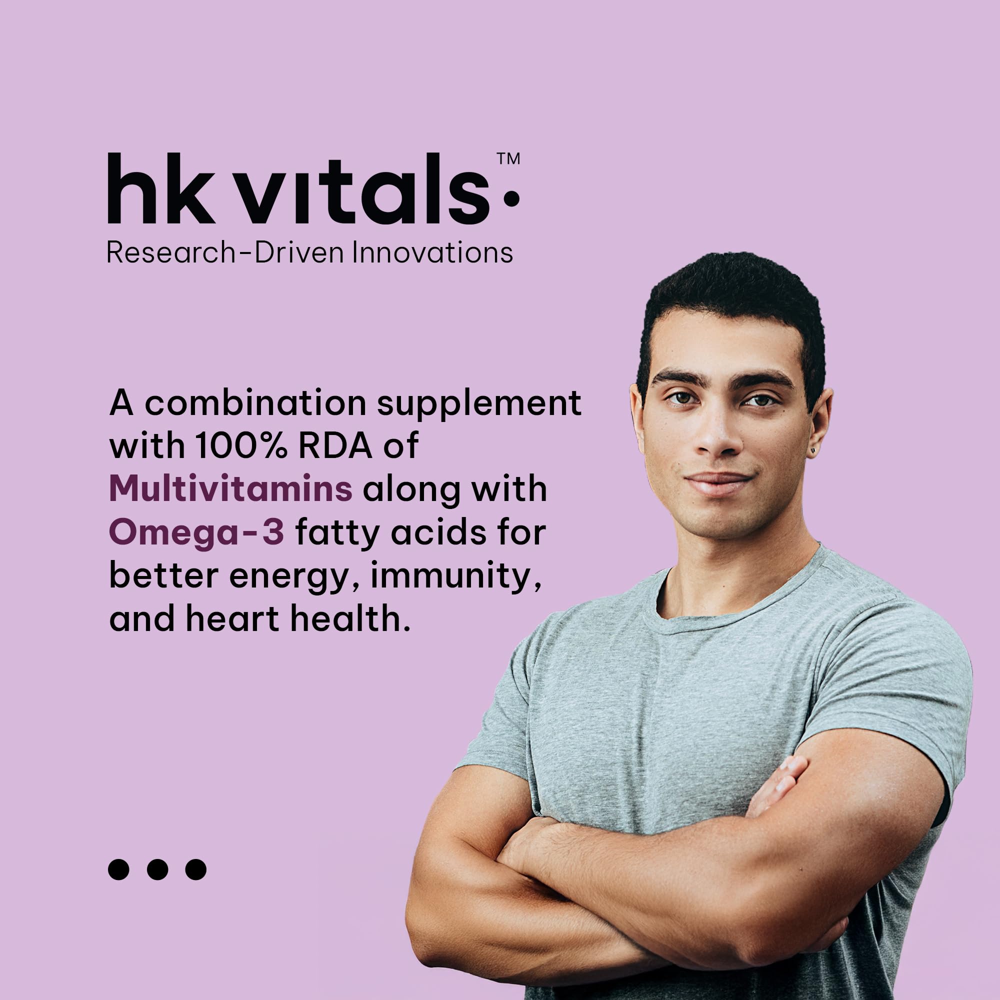 MULTIVITAMIN & OMEGA-3 IN ONE CONVENIENT SOFTGEL CAPSULE: hk vitals Multivitamin+ Omega-3 is a thoughtfully formulated supplement that combines the benefits of multivitamins and Omega-3 fatty acids in a single convenient softgel. This advanced formulation