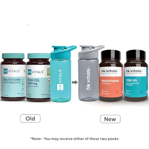 This HealthKart HK Vitals fish oil and multivitamin combo includes Fish Oil (1000 mg Omega 3 with 180 mg EPA & 120 mg DHA) and Multivitamin with Probiotics with 300 ml sipper. HealthKart HK Vitals Multivitamin with Probiotics is a combination of 13 vitamins 11 minerals probiotics Lactobacillus Panax Ginseng and Ginkgo Biloba. Probiotics Lactobacillus in these multivitamin tablets has a soothing effect on the digestive system. These multivitamin tablets help improve the overall energy of the body. Good Bacteria in combination with Vitamins A D C E B6 and B12 folate zinc iron copper and selenium help boost immunity by allowing immune cells to respond better. Panax Ginseng and Ginkgo Biloba may boost the cognitive function of the brain. This helps in managing stress and improving the quality of life. HealthKart HK Vitals Fish Oil Omega 3 consists of 1000 mg bioavailable fish oil with 180 mg EPA and 120 mg DHA to help improve joint flexibility heart health brain health and eye health. Omega 3 in fish oil capsules is extracted from high-grade cold water fishes sourced from Antarctica. It is ultra-pure and micro-filtered. These fish capsules for men and women are Non-GMO and have an anti-reflux formula that ensures better absorption of essential fatty acids so that you get the most out of your fish oil supplements. These fish oil capsules leave no aftertaste or fishy burps.