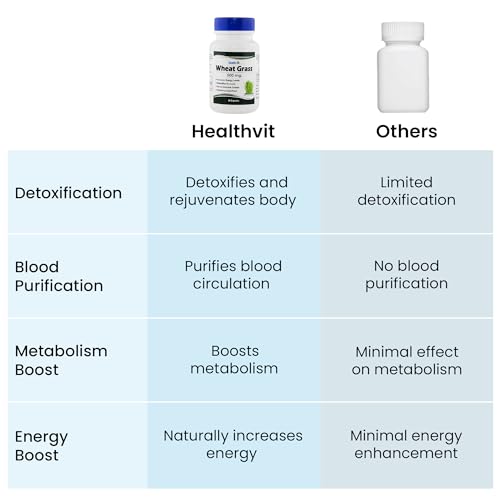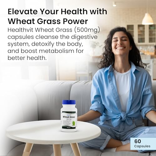 Healthvit 100 percent pure wheat grass 500 mg 60 capsules. Healthvit wheatgrass capsules good source of antioxidants and phytonutrients. Wheatgrass contains about 30 beneficial enzymes. Helps detoxifies and rejuvenates helps increase energy levels naturally boosts the immune system alkalizing super food. One of the most pure and fast selling wheat grass capsules.