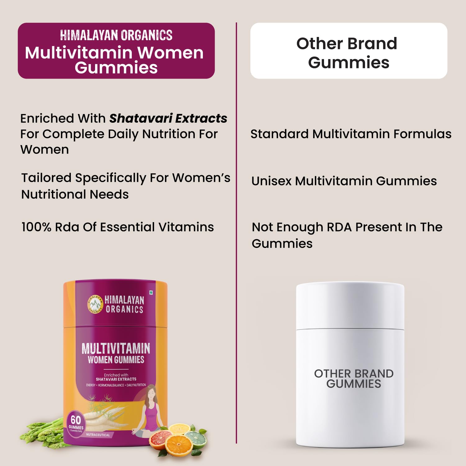 • WOMEN MULTIVITAMIN SUPPLEMENT FOR DAILY NUTRITION- Himalayan Organics Women Multivitamin Gummies are specially formulated to cater the unique needs of women. These Multivitamin Gummies for women health are a tasty and convenient way to nourish your body.
