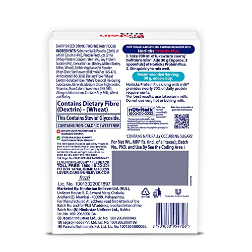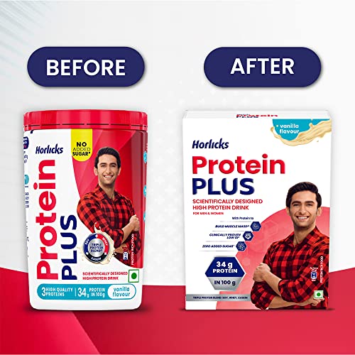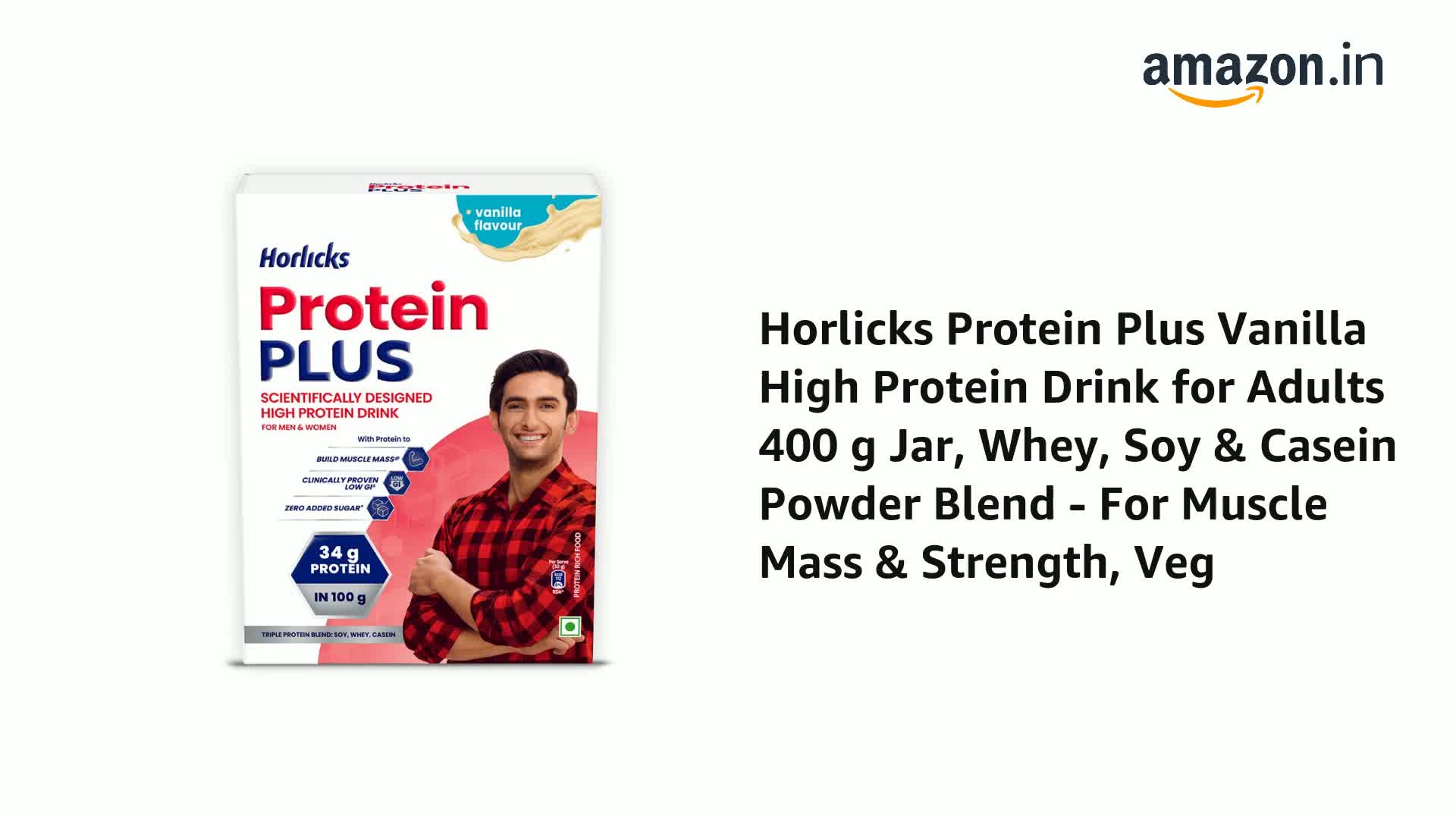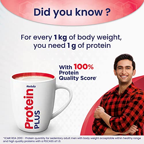 Did you know that âAdults need 1 gram of protein per kilogram of body weightâ. Add Horlicks Protein Plus to your daily diet to help meet your daily protein needs. It delivers 34 g protein in 100 g of the product. It is rich in proteins which help to maintain muscle and support strength. To maintain muscle mass|| one does not just need the right amount of Protein but also the right quality. The quality of Protein can be measured by something called PDCAAS. Whey|| Soy and Casein|| the Proteins in Horlicks Protein Plus all have a PDCAAS score of 1|| the highest score possible on this scale. There are 20 Amino Acids and your body needs all of them to maintain muscle mass and strength. But 9 of them cannot be made in the body and so need to be consumed through diet. These are called essential Amino Acids. Horlicks Protein Plus contains 3 high quality proteins which include fast acting whey|| intermediate acting soy protein and slow acting casein. The 3 Proteins in Horlicks Protein Plus contain all the essential Amino Acids needed to build and maintain muscle mass|| important for strength. Horlicks Protein Plus is a nourishing beverage to be consumed as a part of regular and varied diet. ICMR RDAs 2010 for protein (sedentary adult men). Blend of 3 good quality proteins(whey|| soy|| casein). *OLD