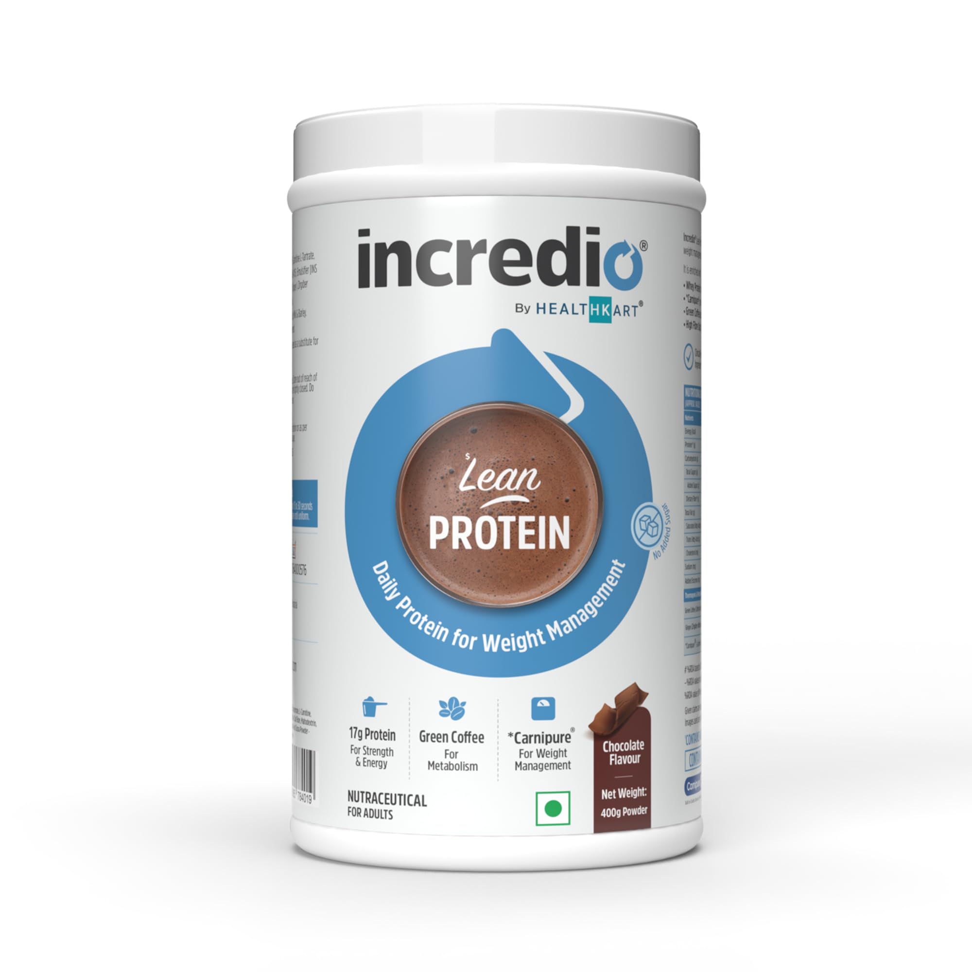 HomeHealth & PersonalDiet & NutritionHealth SupplementsIncredio by HealthKart Lean Protein 17g Whey Protein Per Serving Clinically Proven Carnipure for Weight Management Faster Metabolism & Higher Energy Levels (Chocolate 400 g)