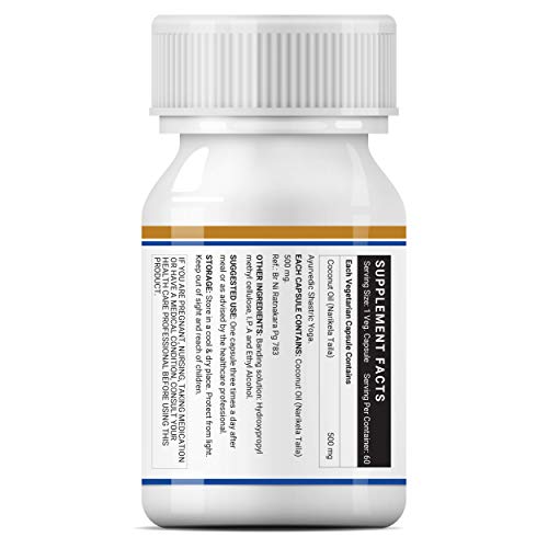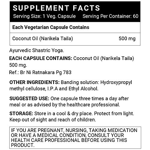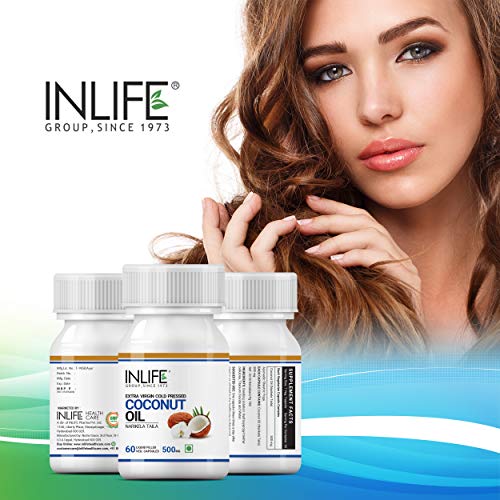 Inlife offers pure Coconut Oil encapsulated in Liquid Filled Vegetarian Capsules. Advantages of liquid filled capsules over softgels: Contains no plasticizers Improves product stability Low moisture intake Effectively masks taste & odour Band sealing prevents leakages Tamper proof capsules Offers enhanced bioavailability One of the main advantages of liquids is that they are absorbed directly by the body without going through break down stages. Active ingredients in liquid form should therefore be absorbed faster than in solid form. Coconut oil is nature's answer to all skin and hair related problems. Coconut oil has been tradionally used for centuries for loss of hair dryness in scalp brittle hair and split ends. The deep nourishing property of coconut oil makes it an ideal moisturizer for dry and flaky skin. The natural antifungal and antiviral properties of coconut oil are useful for all skin problems. Vitamin E and Lauric Acid present in the oil helps reduce the effects of free radicals and oxidative stress from affecting the skin cells and helps makes it appear youthful and supple. Coconut oil also promotes growth of hair reduces all possibility of hair to fall and breakages supplies necessary nutrients to the hair follicles fights dandruff and leaves it looking glossy and full of life. It is natural ayurvedic product. Suggested Usage: Take 1 capsule 2 times daily after meals or as directed by a healthcare professional.