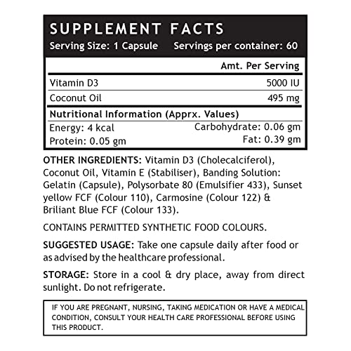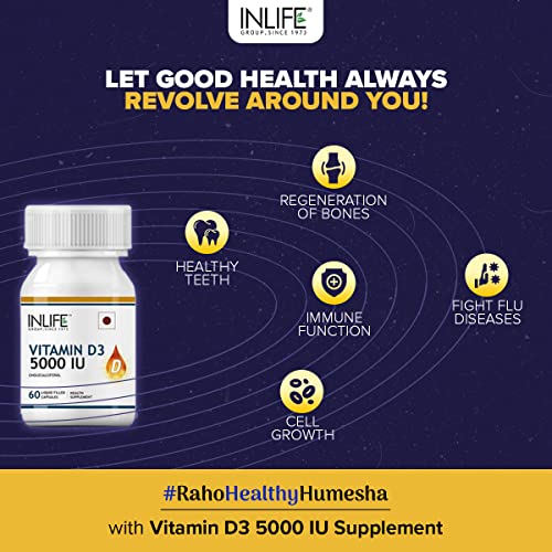 Active form and high absorption. Cholecalciferol is the active form of Vitamin D3 so it provides superior absorption compared to regular Vitamin D3. When taken directly in this format it works more quickly and can be delivered in lower concentrations. Vitamin D3 in liquid filled hard shell capsule form is easy to swallow and convenient to take. Some research indicates that vitamin D3 in liquid filled capsule form is more highly bioavailable than powdered or tablet forms. Activates the immune system. In general vitamin D3 functions to activate the immune systems improve immunity and increase circulation. Vitamin D3 helps enhance calcium absorption by regulating concentrations of calcium and phosphorus in the body to provide essential support for bones and teeth. Vitamin D3 (termed the 'sunshine vitamin') is the same biologically active form of Vitamin D you get from the sun's UVB rays. With this complex you'll get the benefits without the burn. At INLIFE Healthcare we take pride in providing just the right number of Quality ingredients for maximum results - no more no less. Just one small easy-to-swallow liquid filled hard shell capsule per day provides D3 helping you support strong bones and healthy immune system. Our Vitamin D3 is encapsulated in liquid filled hard shell capsules that are having many advantages over soft gels. It contains 4-5 times less gelatine requires no other additives consists of water and gelatine only are stable in hot climates thereby do not stick together and become gluey like soft gelatine capsules will disintegrate faster due to the capsule wall being 5 times thinner than the walls of soft gelatine capsules less product migration into the shell less diffusion of odours.