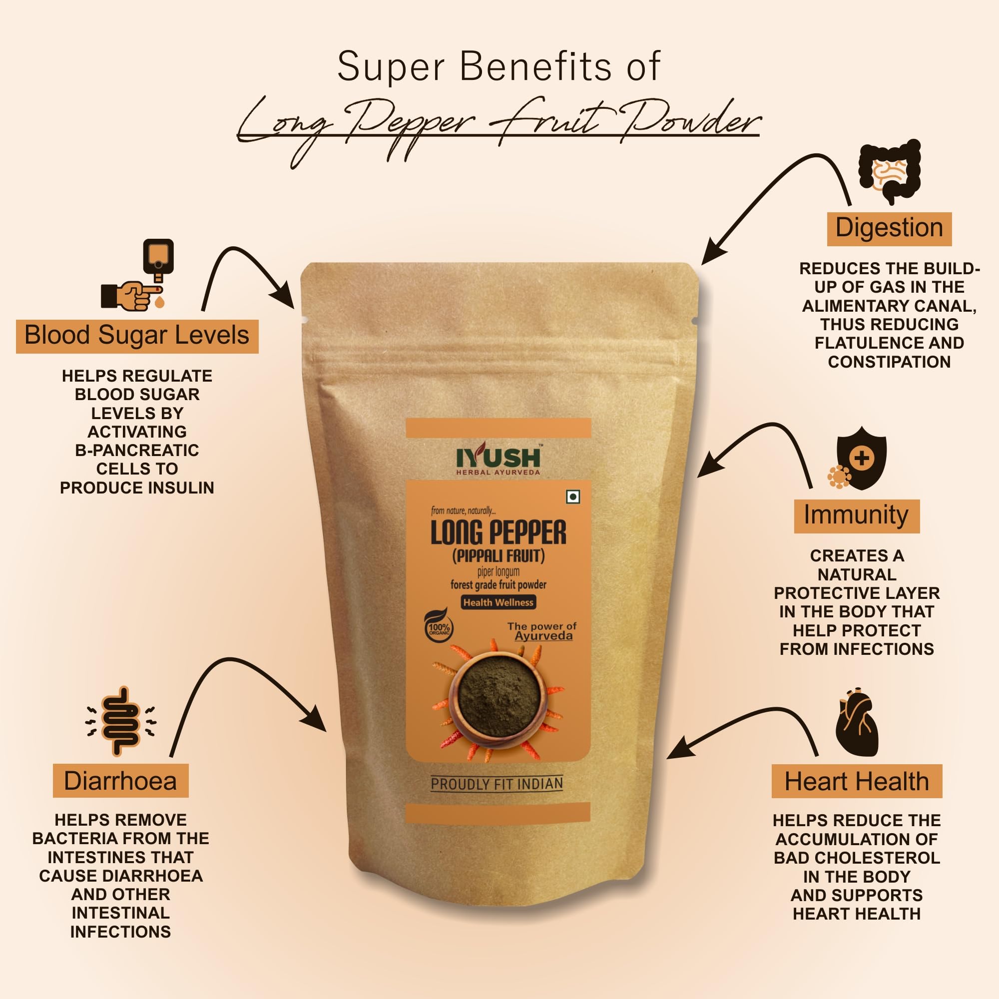 Pippali or Long Pepper also known as Piper longum is a natural herb that has been used in Ayurveda for centuries for numerous health benefits. It is an organic natural powder made from shade-dried wild forest grade Pippali fruit that contain the highest active nutrients grown naturally without any harmful chemicals or pesticides or fertilizers.