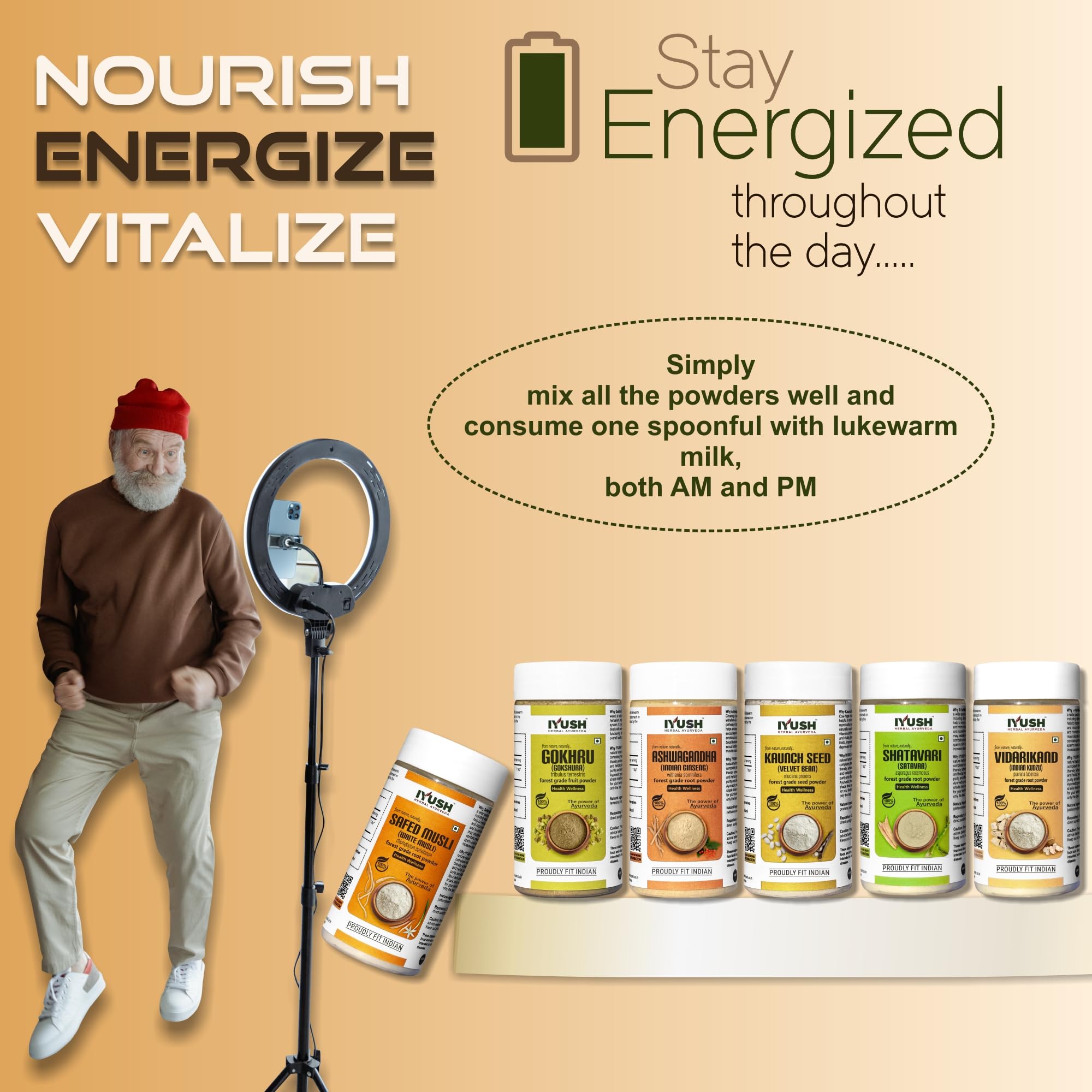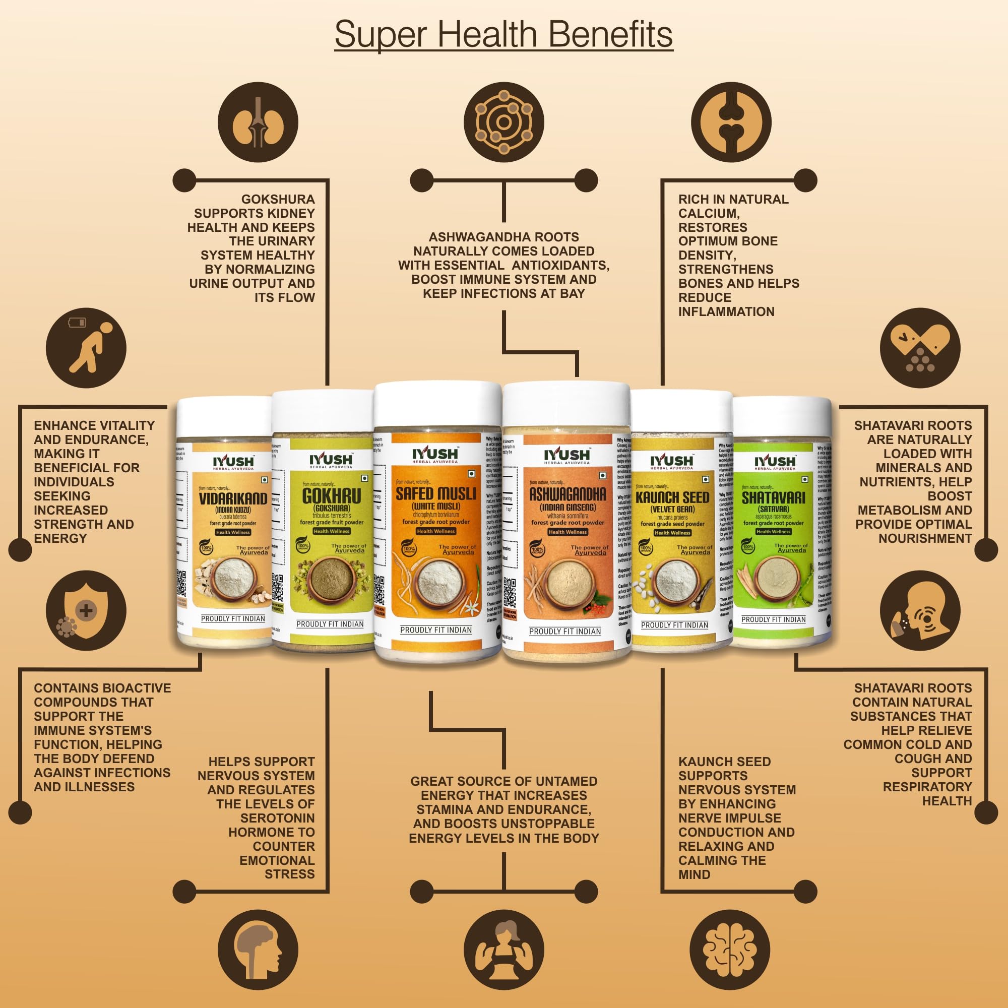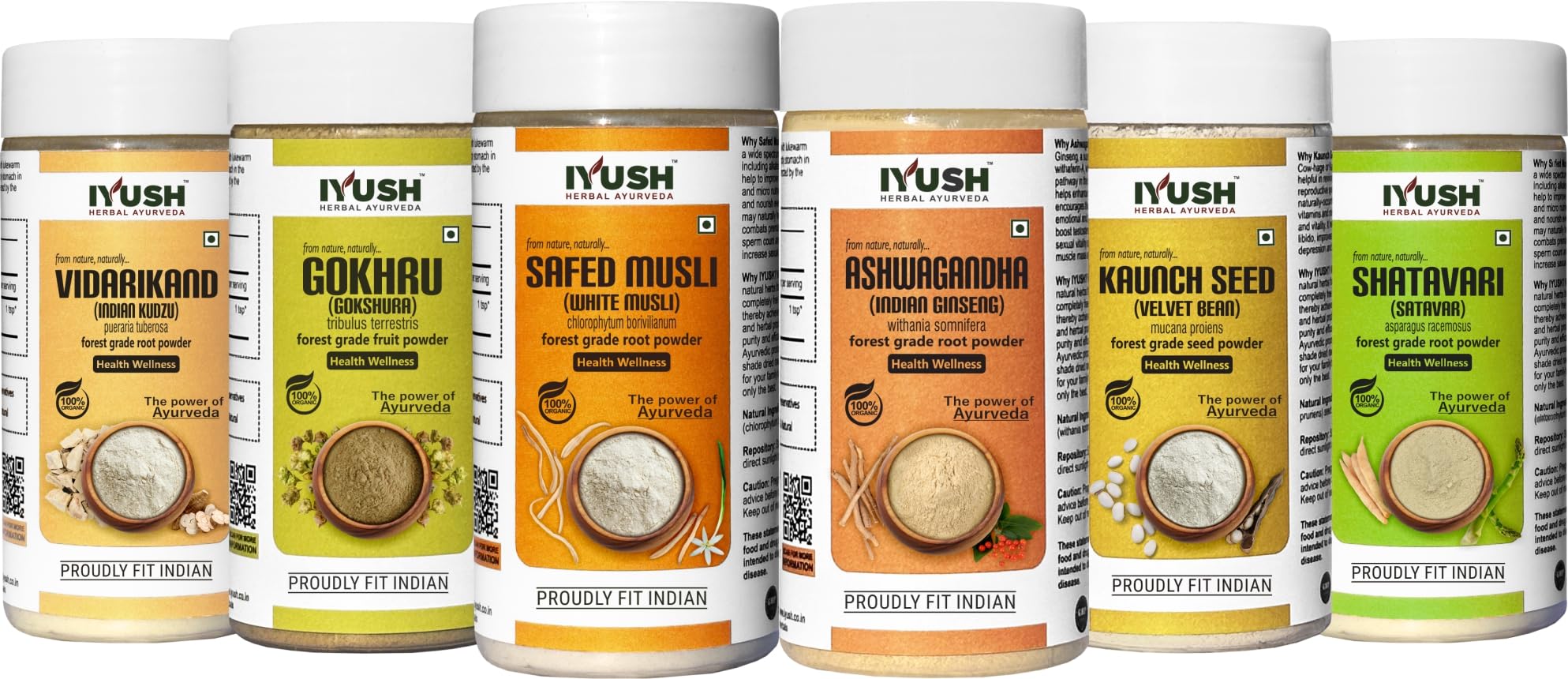 IYUSH Herbal Ayurveda Safed Musli Ashwagandha Kaunch Beej Shatavari Gokhru And Vidarikand Powder - (Total 600gm) 100gm each