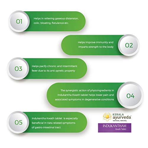 • Indukantham Kwath Tablet helps pacify chronic and intermittent fever due to its antipyretic property. It also helps in relieving gaseous distension colic bloating flatulence etc.