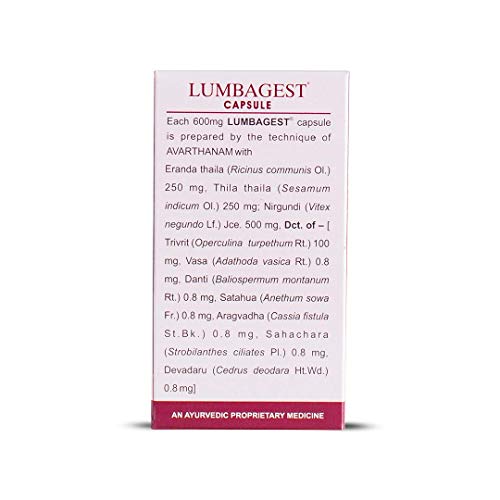 Lumbagest capsule is a proprietary ayurvedic formulation that helps reduce inflammation and provides a quick relief from acute low backache. It combines the goodness of the classical formula Simhasyadi Kwath and Nirgundi - Eranda Prayoga from Bhaishajyaratnavali - renowned for strengthening the low back and manages Kati Shula (low back pain) & disc herniation. Potentiated using 'Avarthanam' a technique of enriching the actives and reducing dosage Lumbagest offers effective solution for LumbarSpondylitis and Sciatica.