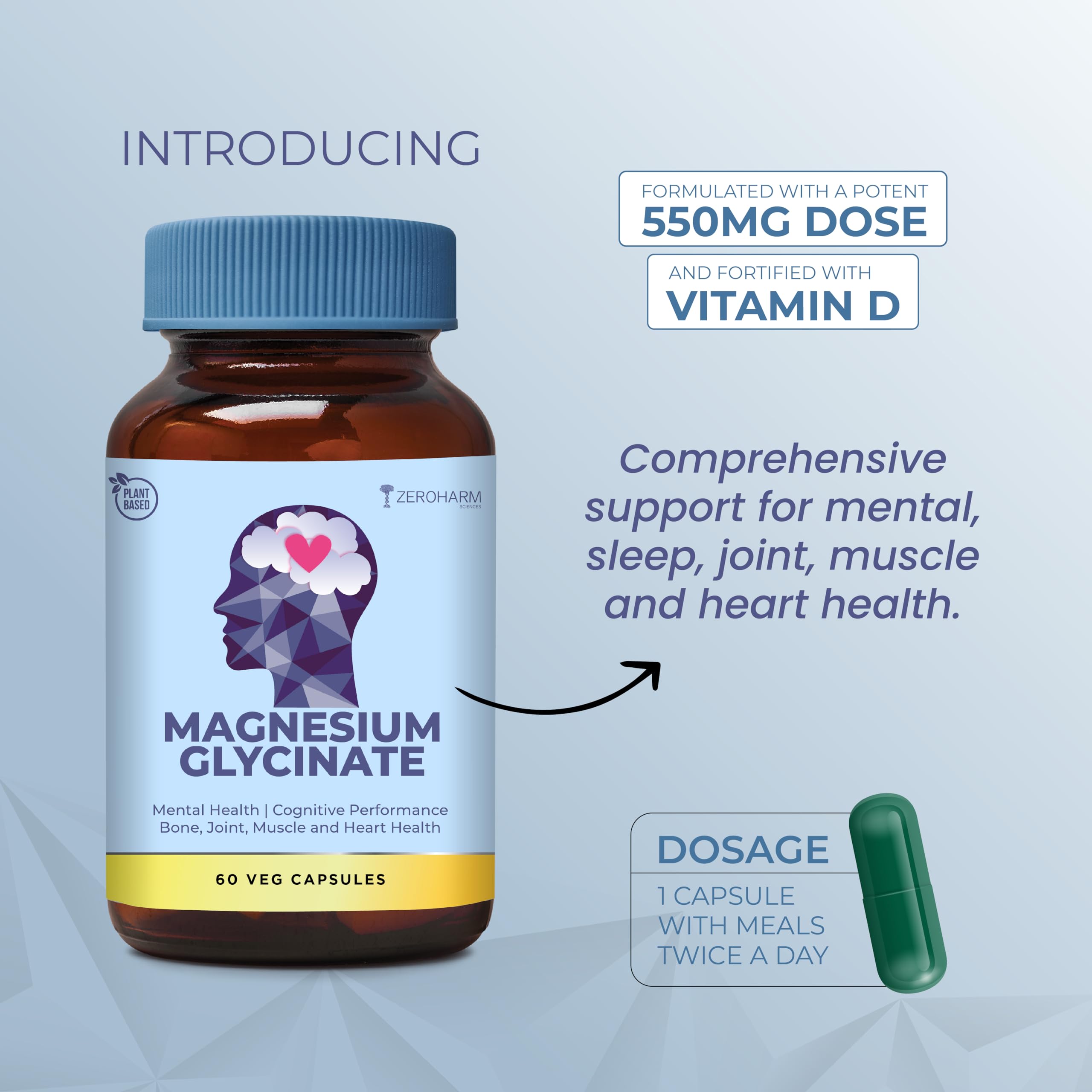 Magnesium Glycinate 1100mg with Moringa Extract - For Stress Sleep Muscle Relaxation Bone & Heart Health - High Absorption - Plant-Based Supplement for Men & Women - 60 Veg Capsules - By ZEROHARM