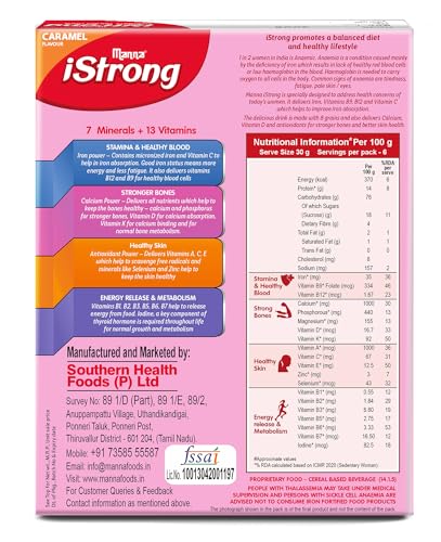 Manna iStrong is formulated with Millets and Super Grains and is sweetened with stevia leaf. It has 100% requirement of Iron for women along with 100% RDA of Vitamin C which helps in the absorption of Iron into the blood steam. It also has Vitamin B9 and