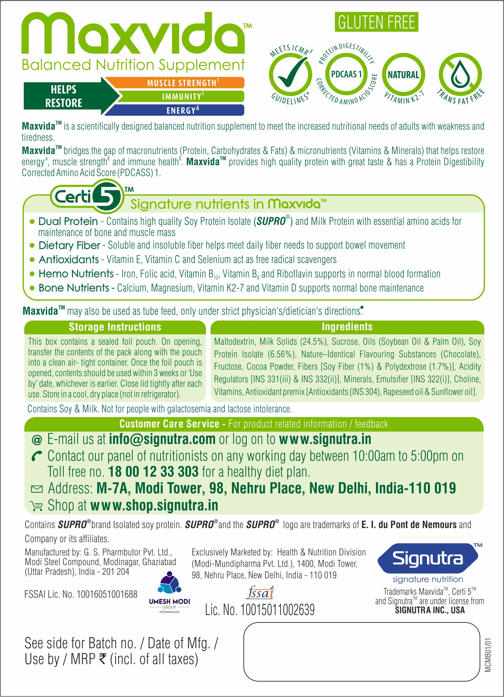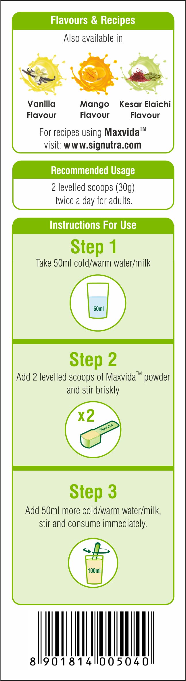Maxvida is formulated with the benefit of Certi5 Signature nutrients Dual Protein Dietary Fiber Antioxidants Hemo Nutrients and Bone Nutrients which help in restoring Immunity Energy and Strength