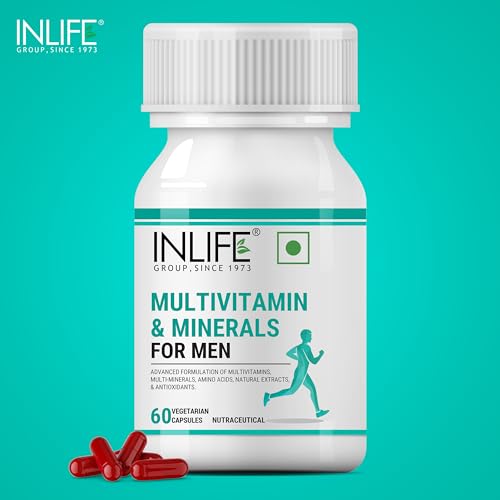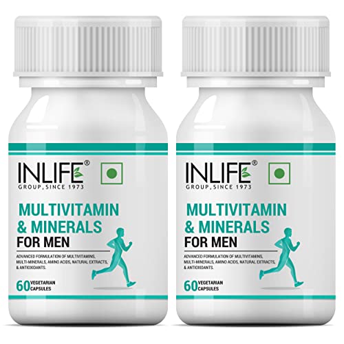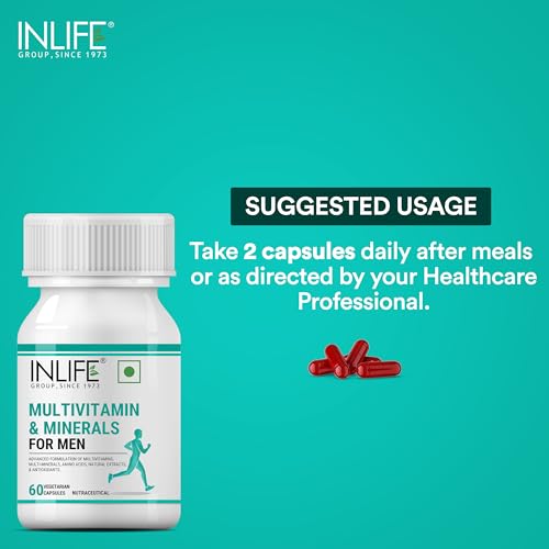 INLIFE Multivitamin & Minerals Capsules for Men provides the perfect number of vitamins minerals antioxidants specially designed for leading concerns of men. It helps to maintain a healthy body with overall wellness. Enrich your diet with Quality vitamins & minerals. Energize and supercharge your activities without caffeine or sugar. Contains 25 essential vitamins & minerals in an advanced formula along with amino acids L-Taurine L-Glutamine DL-Methionine & L-Arginine natural extracts of Ginseng Grape Seed Ashwagandha and added benefits of Alpha Lipoic Acid Lycopene Lutein & Zeaxanthin. Offers immune support increased energy and mental alertness by providing your body with all it needs. It supports heart health bones nervous & hormones system. Our blend of essential vitamins and minerals is believed to support nutritional balance promote optimal health boost energy and stamina levels. Complete pure vitamins and mineral combination with size â¬Ë0' capsule means easy to swallow. 1-month supply of 60 capsules made according to the GMP standards. As a dietary supplement take two (2) capsules together once a day after breakfast with a full glass of water or as directed by your healthcare professional. For those with a more sensitive constitution we recommend taking one (1) capsule twice per after meal with a full glass of water. Consider ordering one bottle for yourself and another for a friend or loved one. Keep each other motivated and reach your goals together and more quickly. INLIFE Healthcare stands by every quality product they make. We manufacture only premium and extra pure but high potency vitamins capsules tablets powders multivitamins herbal supplements and natural herbal skin & personal care products for men women and children. Check INLIFE Healthcare out today!.