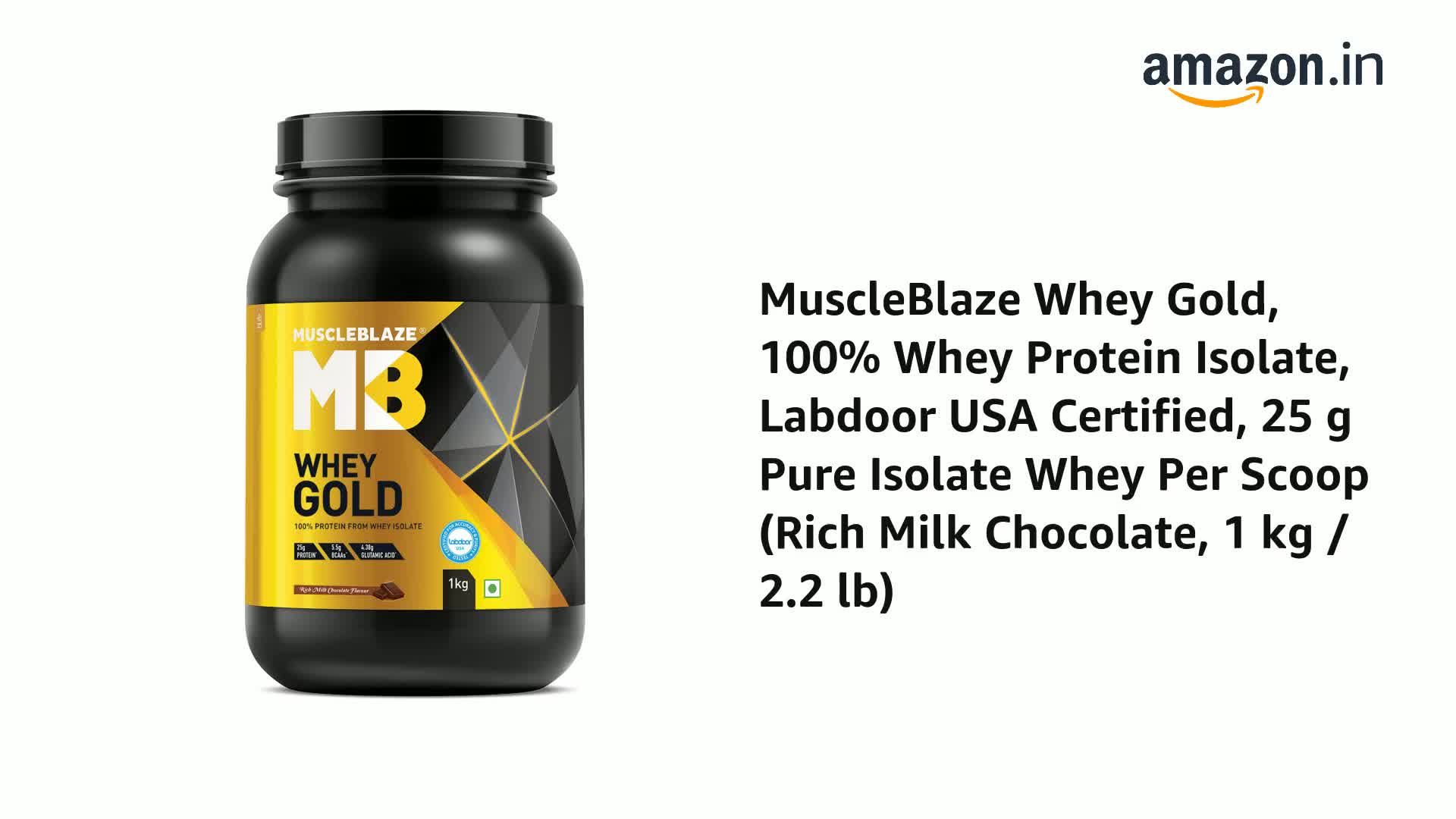 MuscleBlaze Whey Gold, 100% Whey Protein Isolate, Labdoor USA Certified, 30g Whey Protein Per Scoop (Rich Milk Chocolate, 1kg / 2.2lb)