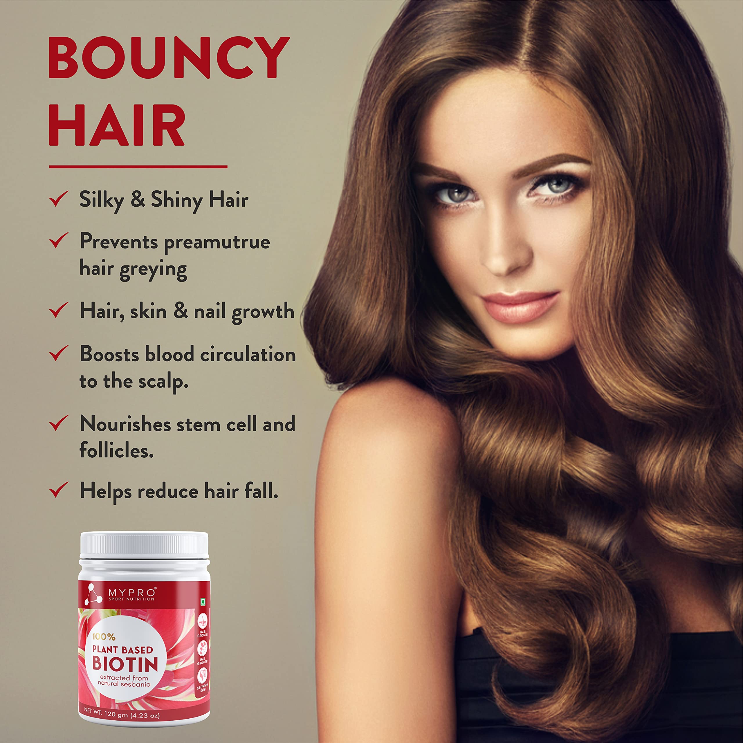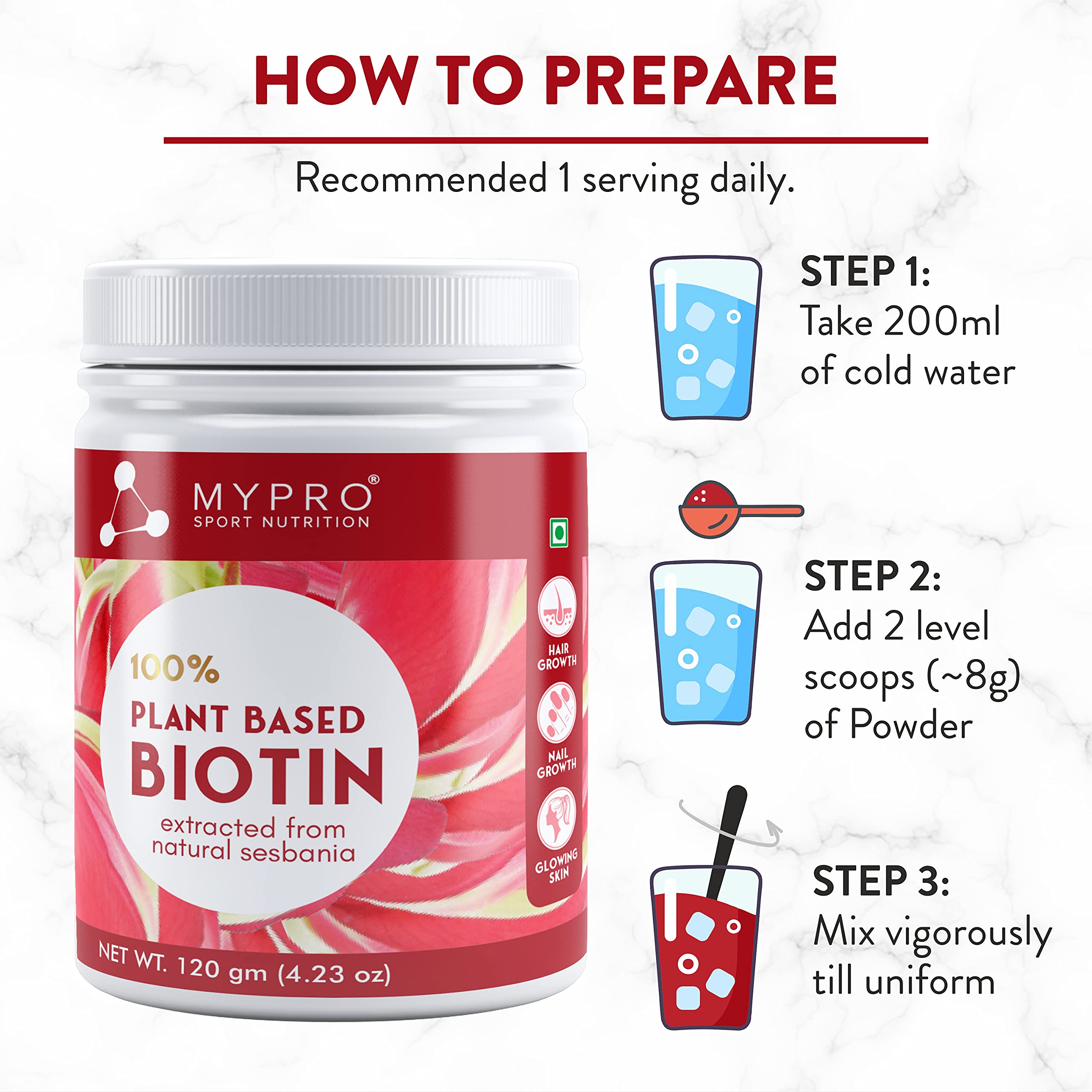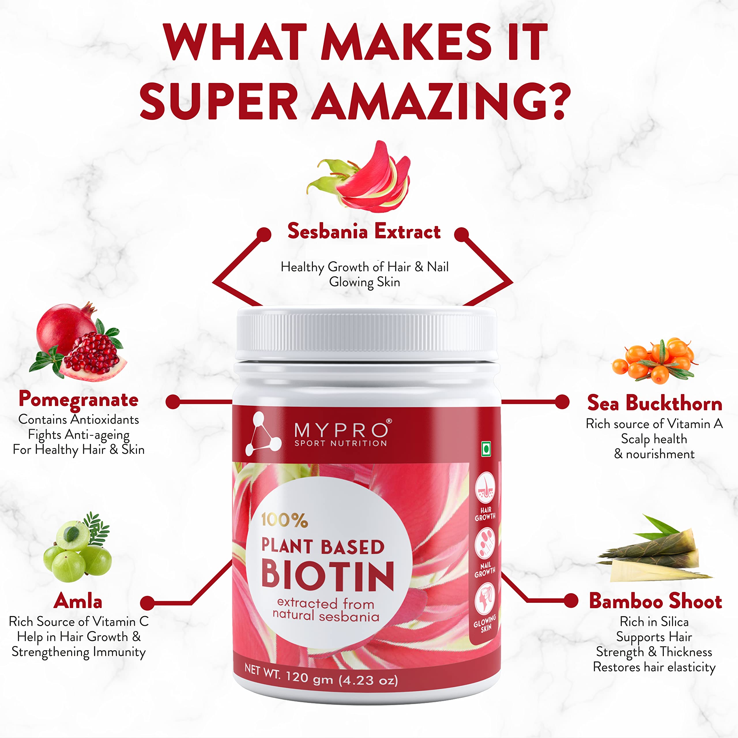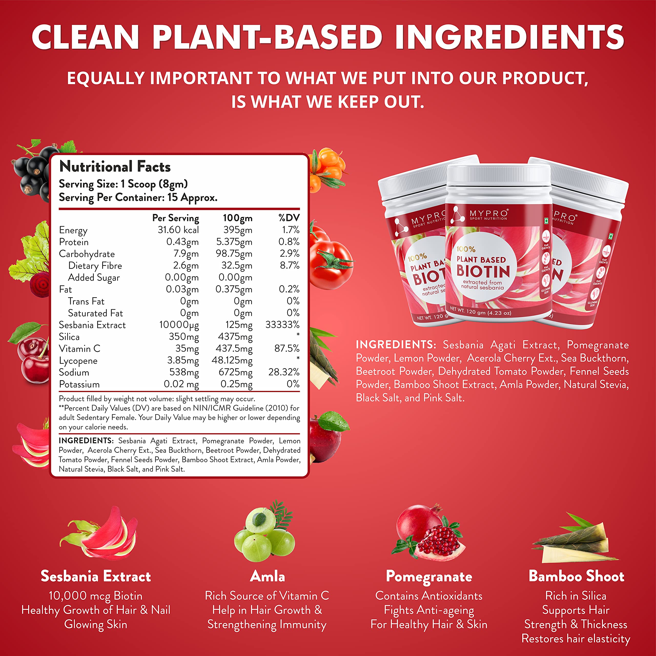 Mypro Sport Nutrition 100% Plant Based Biotin Extracted From Natural sesbania With AmlaPomegranateSea BuckthronBamboo Shoot - 120 Gm Powder (4.23 oz)