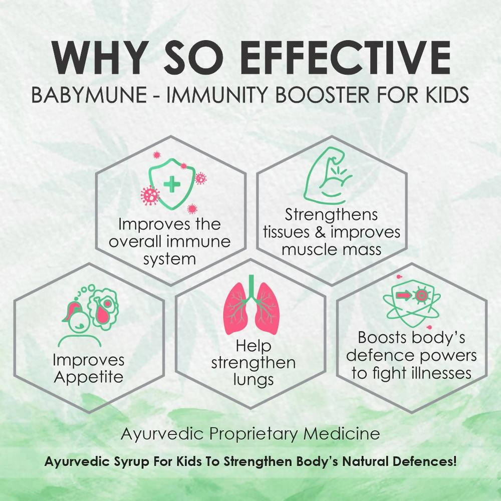 Namyaa Babymune Syrup: Key Ingredients:AshwagandhaVavdingBalaKalmeghGingerAtasiMadhuparniDirections of use:For Ages Up to 5 Years: It is recommended that the child is given 5ml of the Namyaa Babymune- Immunity Booster twice daily or as directed by the expert.For Ages 5 years and above: It is recommended that the child is given 10ml of the Namyaa Babymune- Immunity Booster twice daily or as directed by the expert.Legal Disclaimer: Statements regarding dietary supplements have not been evaluated by the FDA and are not intended to diagnose, treat, cure, or prevent any disease or health conditionNote: The product is guaranteed to be 100% genuine. Product images are for illustrative purposes only. Images/packaging/ labels may vary from time to time due to changes made by the manufactur