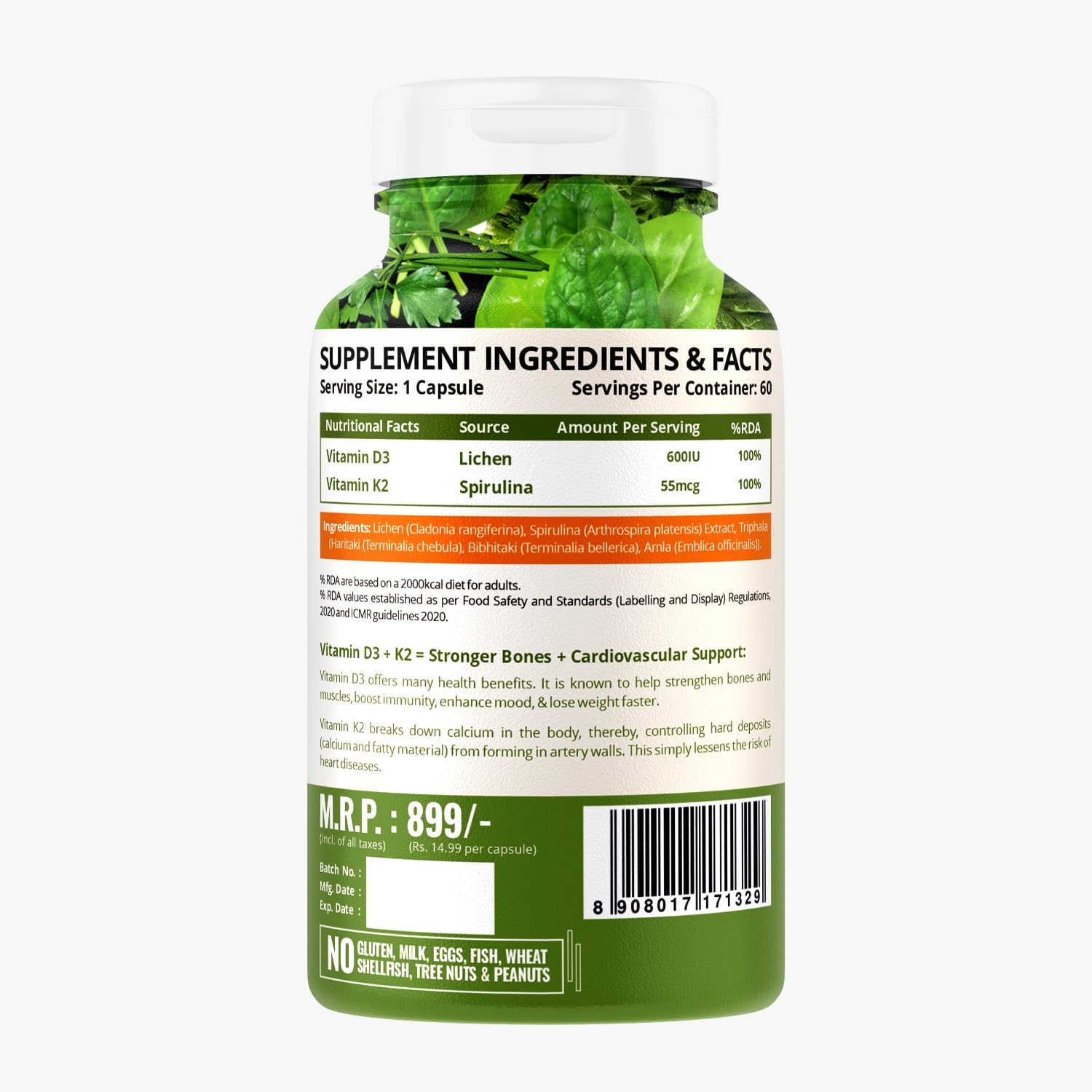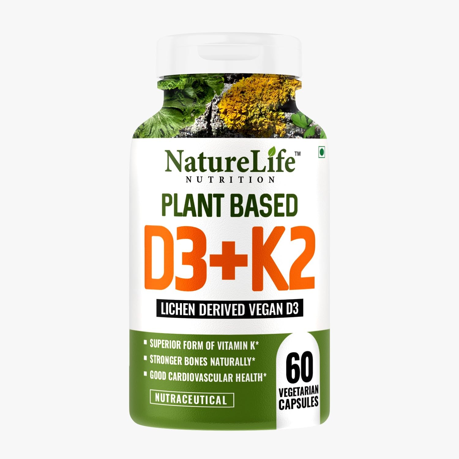 PLANT-BASED FORMULA: Nature Life Nutrition Vitamin D3+k2 capsules is a plant-based formula made up most naturally with Mustard Green Spinach Leaves Beetroot Parsley Leaves and Lichen. These capsules are free from artificial coloring binders fillers chemic