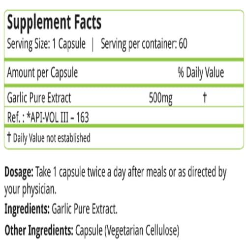 Garlic contains many sulfur compounds vitamins A and C and various amino acids. Garlic also contains a wide range of trace minerals. These include copper iron zinc magnesium germanium and selenium. The most active components of fresh garlic are an amino acid called alliin and an enzyme called allinase. SATISFACTION GUARANTEE: Our Products are manufactured to bring CUSTOMER DELIGHT. HIGHEST POTENCY: Our formula has 500mg of Garlic pure extract per serving (Highest Potency) for enhanced absorption and bio-availability. ALL NATURAL NO PRESERVATIVES NO ADDED EXCIPIENTS. PHARMACIST FORMULATED: Our Products are formulated by Pharmacists and manufactured in a FSSAI /AYUSH-approved facility following strict GMP guidelines. We assure the and purity of each batch. INGREDIENTS: Not only is our Product more potent but is sourced from Reputed Manufacturers. We only use pure and raw ingredients in all our formulas.