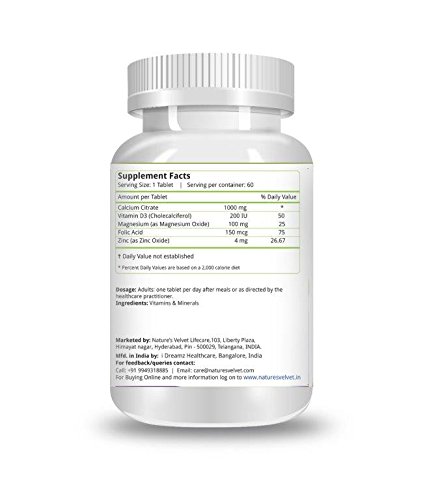 Nature's velvet calcium magnesium zinc are three of the most important minerals the body needs to gain and maintain good health. Calcium and magnesium help maintain healthy bones while zinc is essential for cell division and growth as well as body's immune system. Calcium citrate is more absorbable calcium supplement. Prevents degeneration of bones also helps in prevention of osteoporosis boosts collagen production also has folic acid useful for cell growth and metabolism.
