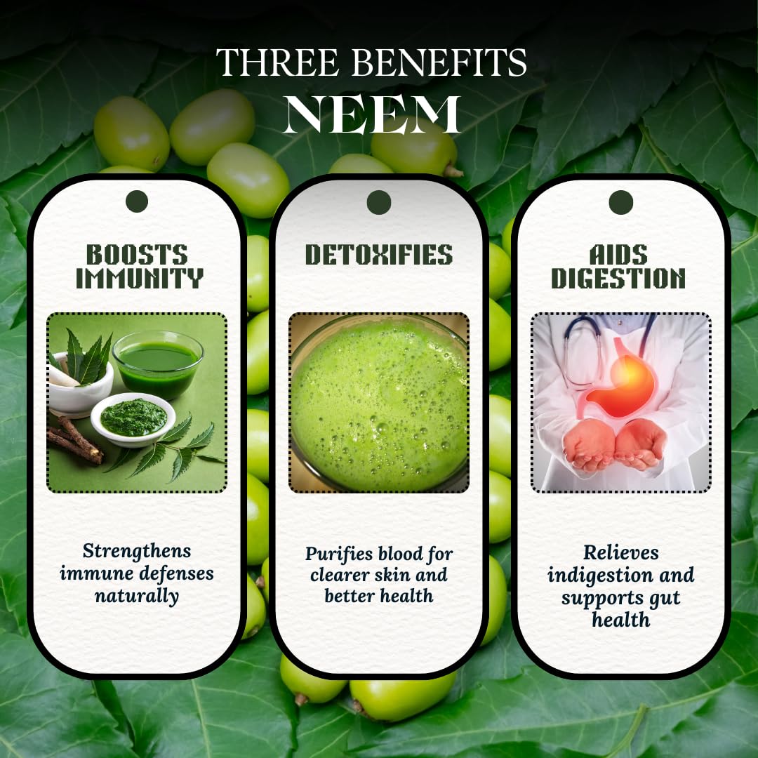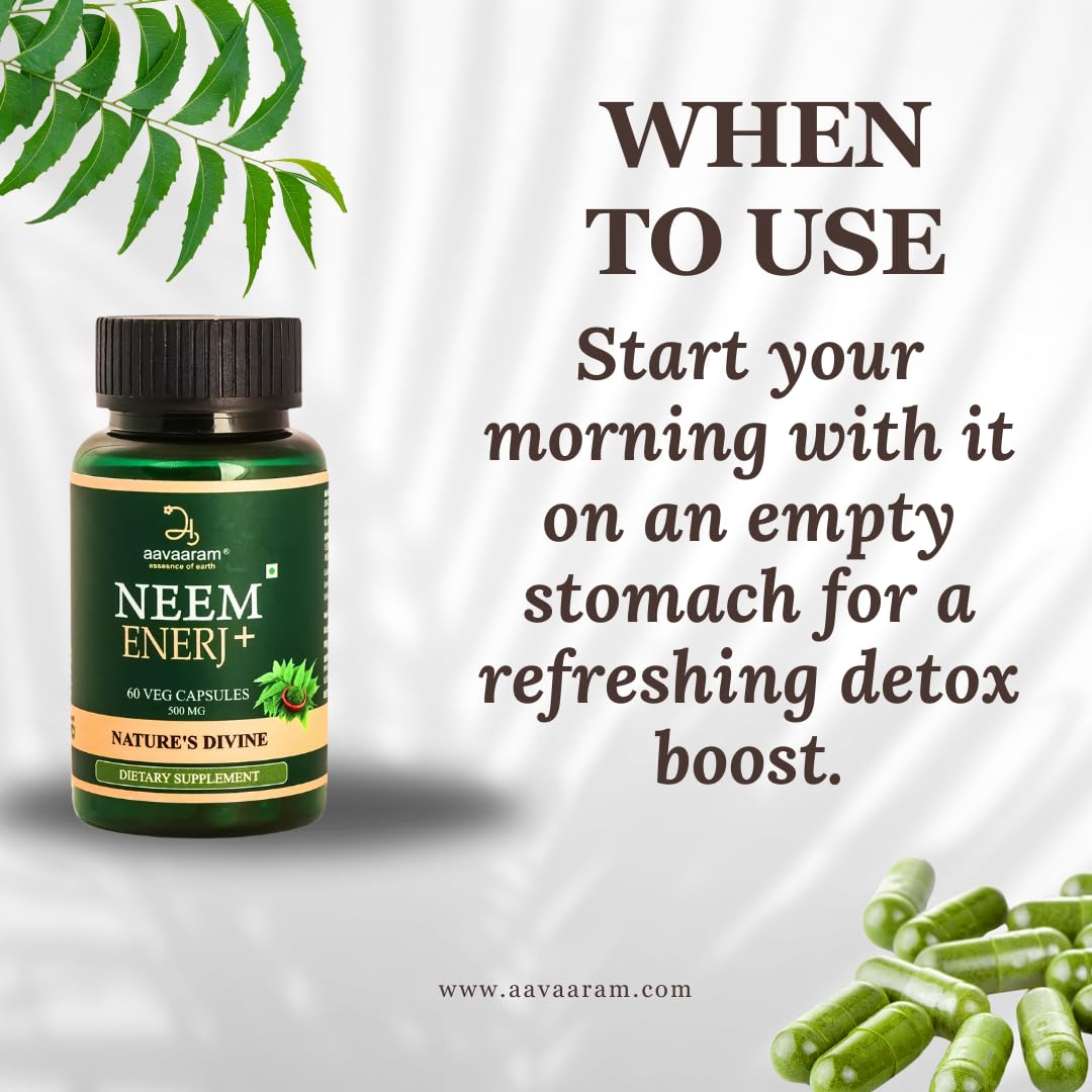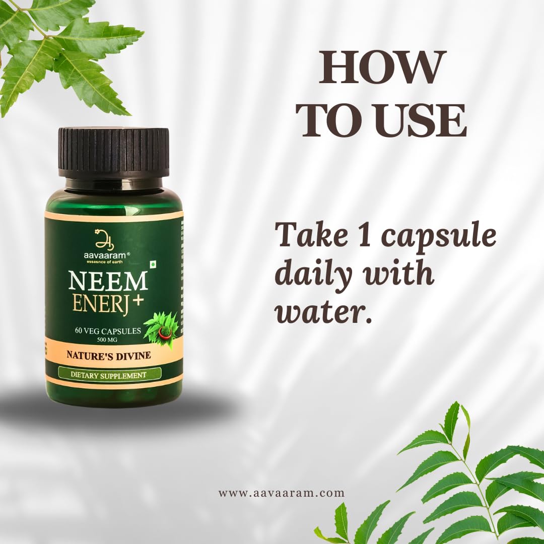 Neem Capsules â Your Natural Shield for Wellness Boost your overall health with our Neem Capsules made from 100% pure Neem (Azadirachta indica) leaf extract. These vegetarian capsules are designed to purify protect and revitalize your body providing a natural solution for internal and external wellness. Key Benefits: Supports healthy skin by combating impurities. Promotes detoxification and immune system health. Contains powerful antibacterial and antioxidant properties. Why Choose Our Neem Capsules? 100% natural and free from artificial additives. Convenient vegetarian capsules for daily use. Perfect for those seeking holistic support for skin and body health. Usage: Take 1-2 capsules daily with water or as directed by a healthcare professional. Purify your body and rejuvenate your health naturally with Neem Capsules!