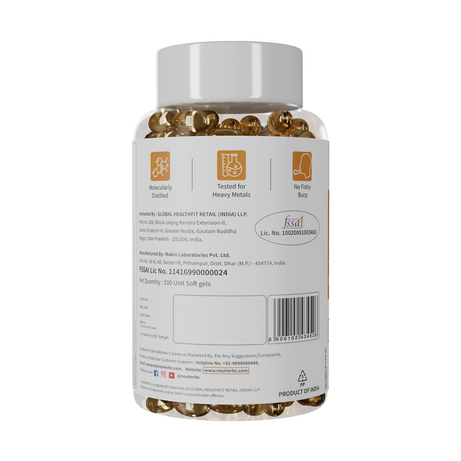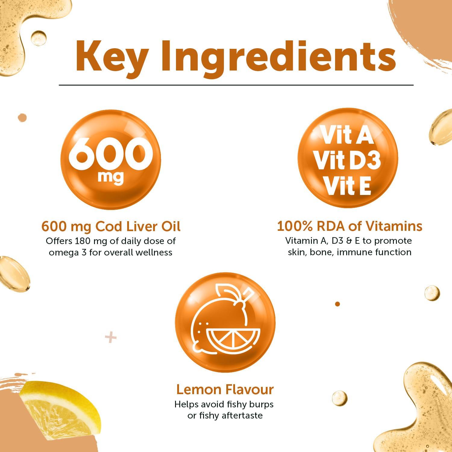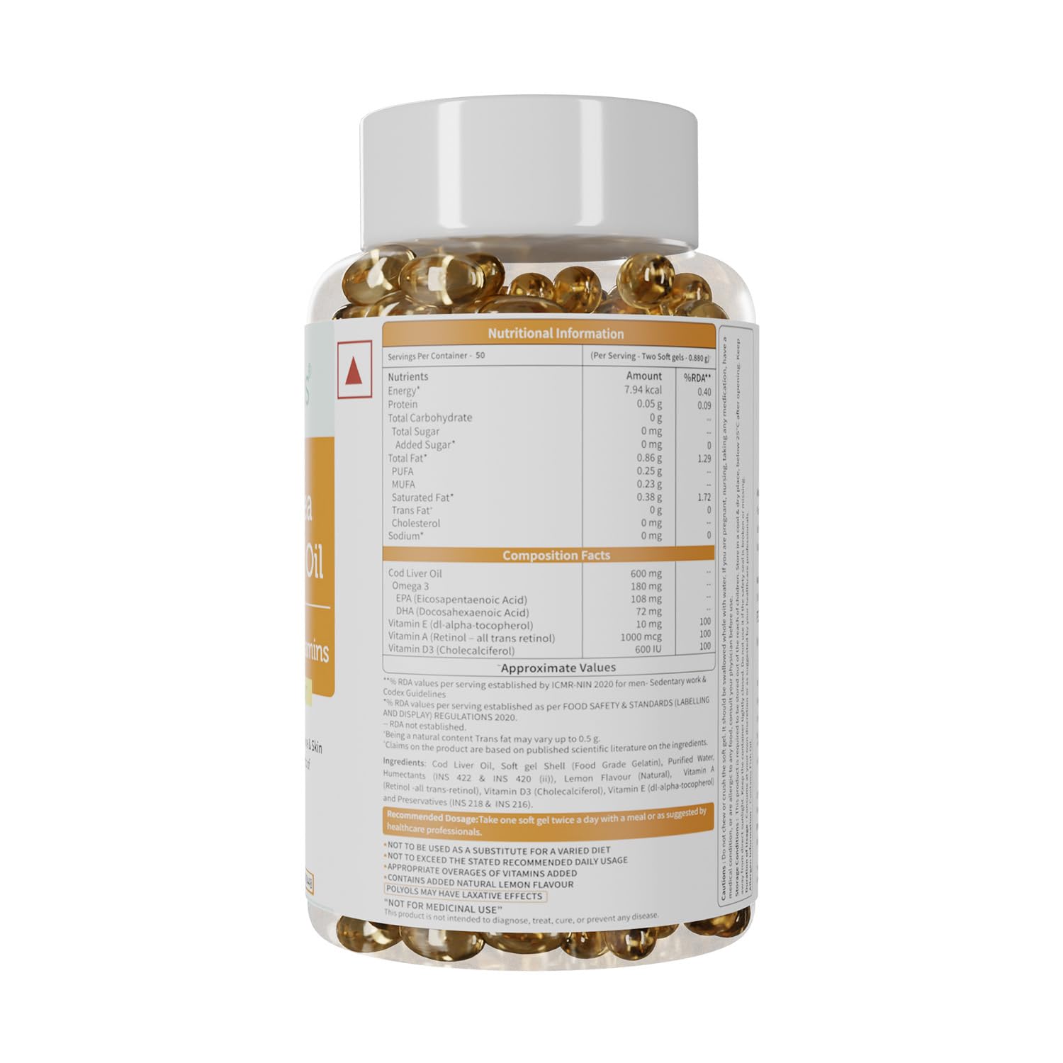 Neuherbs Deep Sea Omega 3 Cod Liver Oil- 100 Softgels for Men & Women | Omega 3 Supplement 600 Mg 100% RDA of Vitamins A D3 & E for Heart Brain Bone & Skin Health | No Fishy Burps with Lemon Flavour