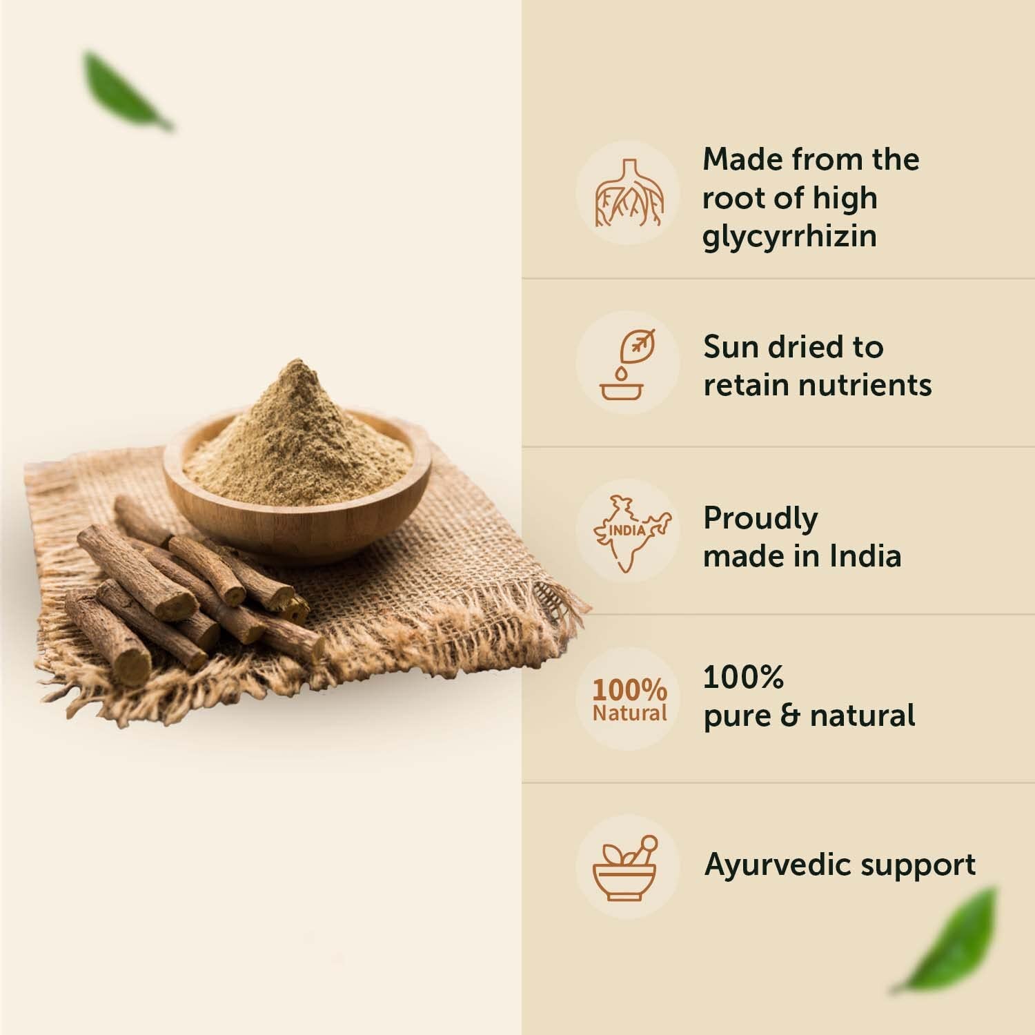 • 100% Organic Mulethi Powder- Obtained from the purest natural & organic mulethi extracts.