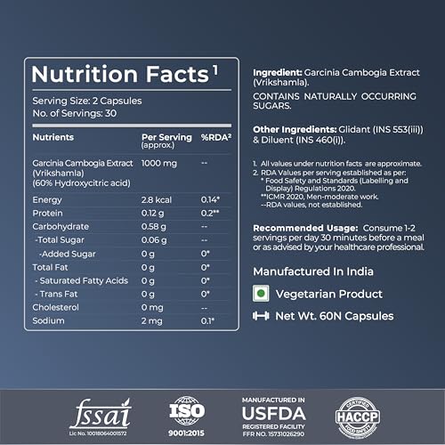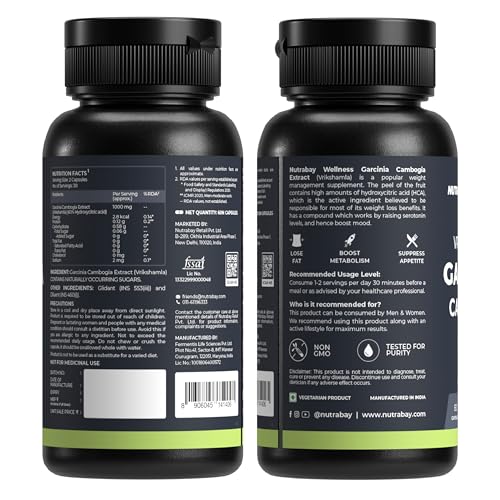 Nutrabay Wellness Garcinia Cambogia helps to reduce your appetite block fat production and reduce belly fat. It also blocks the production of new fats in your body boosts your digestive system. It is the ideal fat burner supplement for men and women. It works on all types of fat stored on your body like belly fat arms fat thigh fat and is useful for decreasing weight. It burns calories boosts energy enhances energy and promotes healthy metabolism. A healthy metabolism is a key to losing out. So you can burn more calories and lose more weight. It can be consumed by anyone daily for the best result. Non-GMO Gluten-Free Does NOT Contain Soy Dairy Yeast Eggs Corn Nuts Caffeine Additives Preservatives or Coloring. Consume 2 capsules daily 30 minutes before meal or as suggested by healthcare professionsal / dietician. This product can be consumed by Adults Elderly Men & Women.
