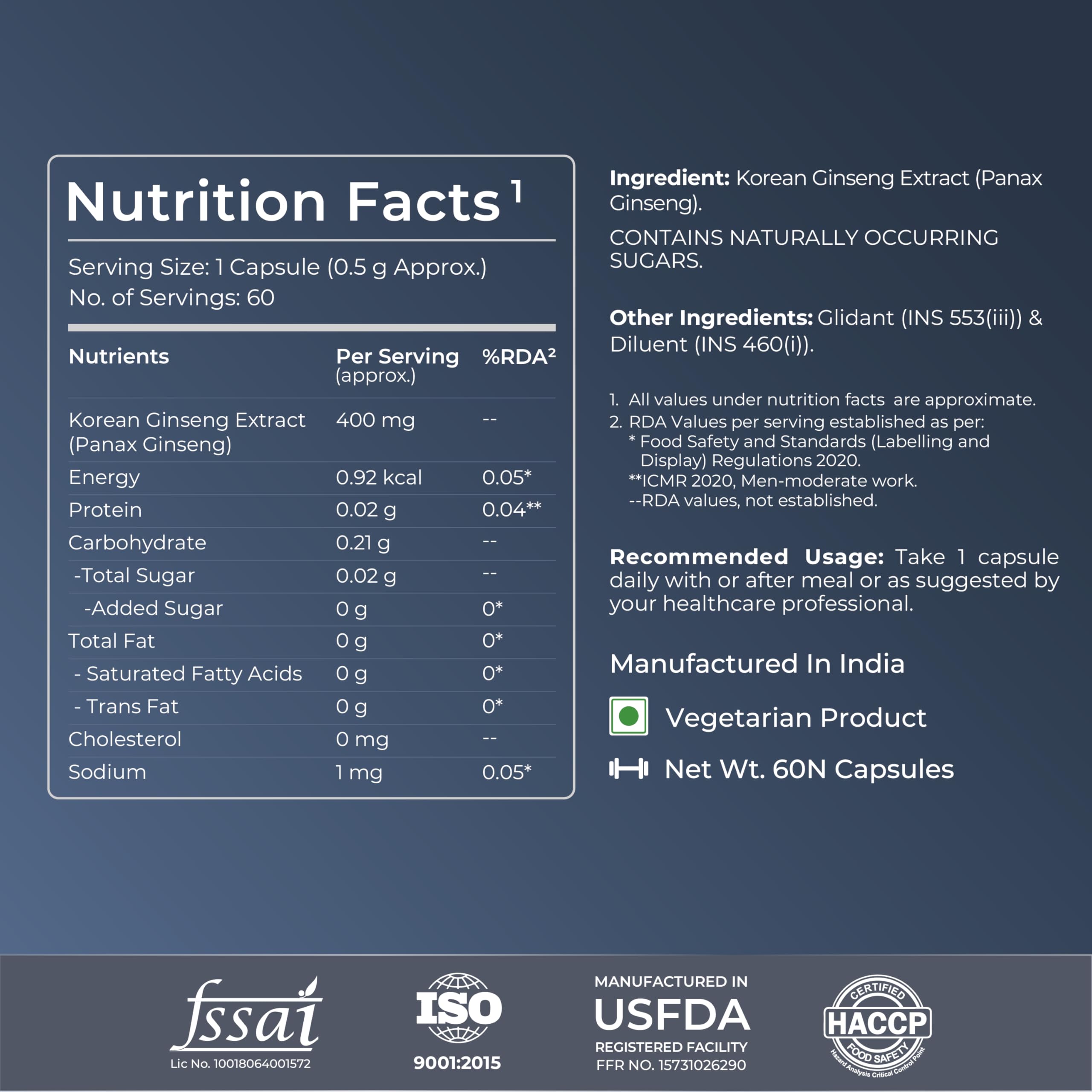 Nutrabay Wellness Korean Ginseng contains a wide array of nutrients including antioxidants vitamins minerals and intriguing compounds called ginsenosides and provide a powerful boost to energy and stamina in men and women. Korean Ginseng Capsules help elevate mood and relieve stress effectively. It will help keep your mind in the task you take and also help you get things done with enhanced focus. Korean Ginseng works naturally to stimulate brain cells resulting in better concentration and cognitive thinking. It has proven to have effects on the cognitive functions such as attention working memory performance reaction time in the individuals. It can be consumed by anyone daily for the best result. Non-GMO Gluten-Free Does not Contain Soy Dairy Yeast Eggs Corn Nuts Caffeine Additives Preservatives or Coloring. Consume 1 capsule daily before or after meal or as suggested by healthcare professionsal / dietician. This product can be consumed by Adults Elderly Men & Women.