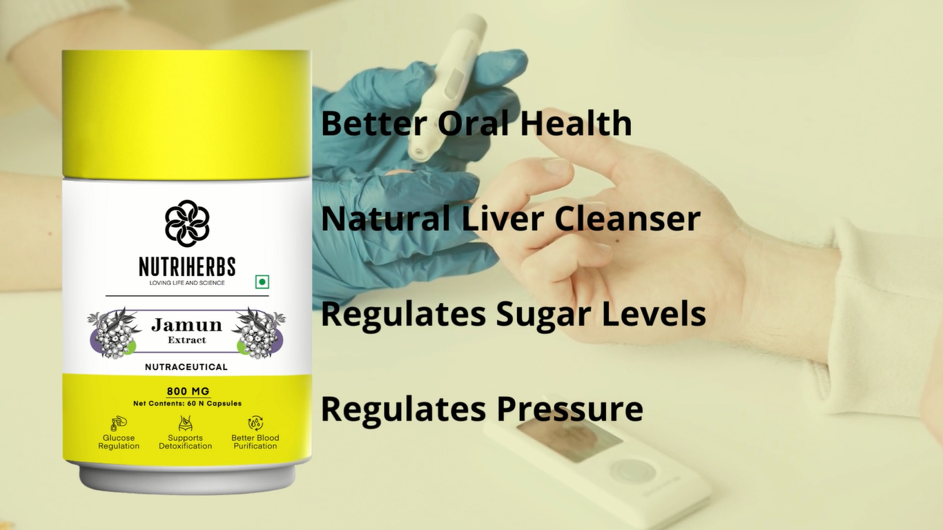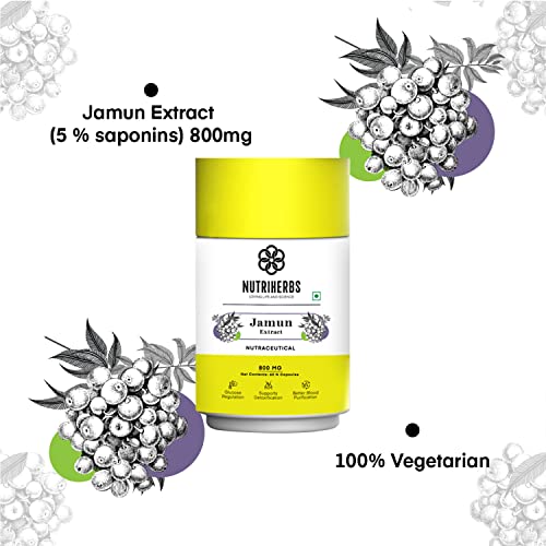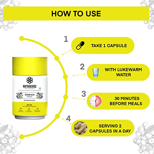 • Nutriherbs Jamun Extract Capsules are enriched with multi-nutrient benefits. Jamun capsules has the correct combination of essential nutrients with fewer calories. The presence of flavonoids essential oils and organic acids like malic acid and oxalic acid