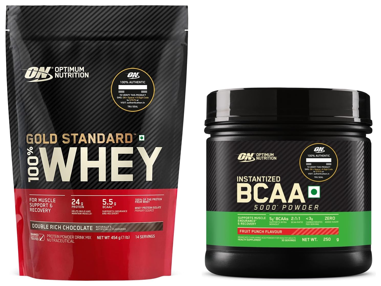 Optimum Nutrition (ON) Gold Standard 100% Whey Protein Powder - 1 lb (Double Rich Chocolate) Primary Source IsolateOptimum Nutrition's Gold Standard 100% Whey uses pure Whey Protein Isolates as the primary ingredient. Combined with ultra-filtered whey protein concentrate each serving provides 24 grams of all-whey protein and 5.5 grams of naturally occurring Branched Chain Amino Acids (BCAAs) which are prized by athletes for their muscle building qualities. With 10 tempting flavors to choose from ON Gold Standard 100% Whey gives you plenty of ways to keep workout recovery interesting. To instantly check the authenticity of your ON product SMS us your 6 digit unique code (on the pack) at 57575 or visit our wesite AUTHENTICATEON.inOptimum Nutrition BCAA 5g BCAAs in 2:1:1 Ratio 30 servings For Muscle Recovery & Endurance Intra workout Informed Choice certified (250gm Fruit Punch)BCAA 5000 Powder by Optimum Nutrition delivers five grams of BCAAs per serving in the preferred 2:1:1 ratio of leucine to isoleucine and valine to support muscle recovery and endurance. Itâs instantized for easy mixing into water juice or post-workout shakes. Each 250gm has 30 servings and comes in two delicious flavours.
