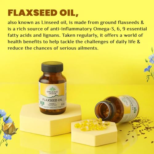 RGANIC INDIA Flaxseed Oil 60 Capsules for Omega-3 & Heart Health Rich in Omega-3 helps reduce high cholesterol plays a role in burning body fat and supports healthy skin & nails.
