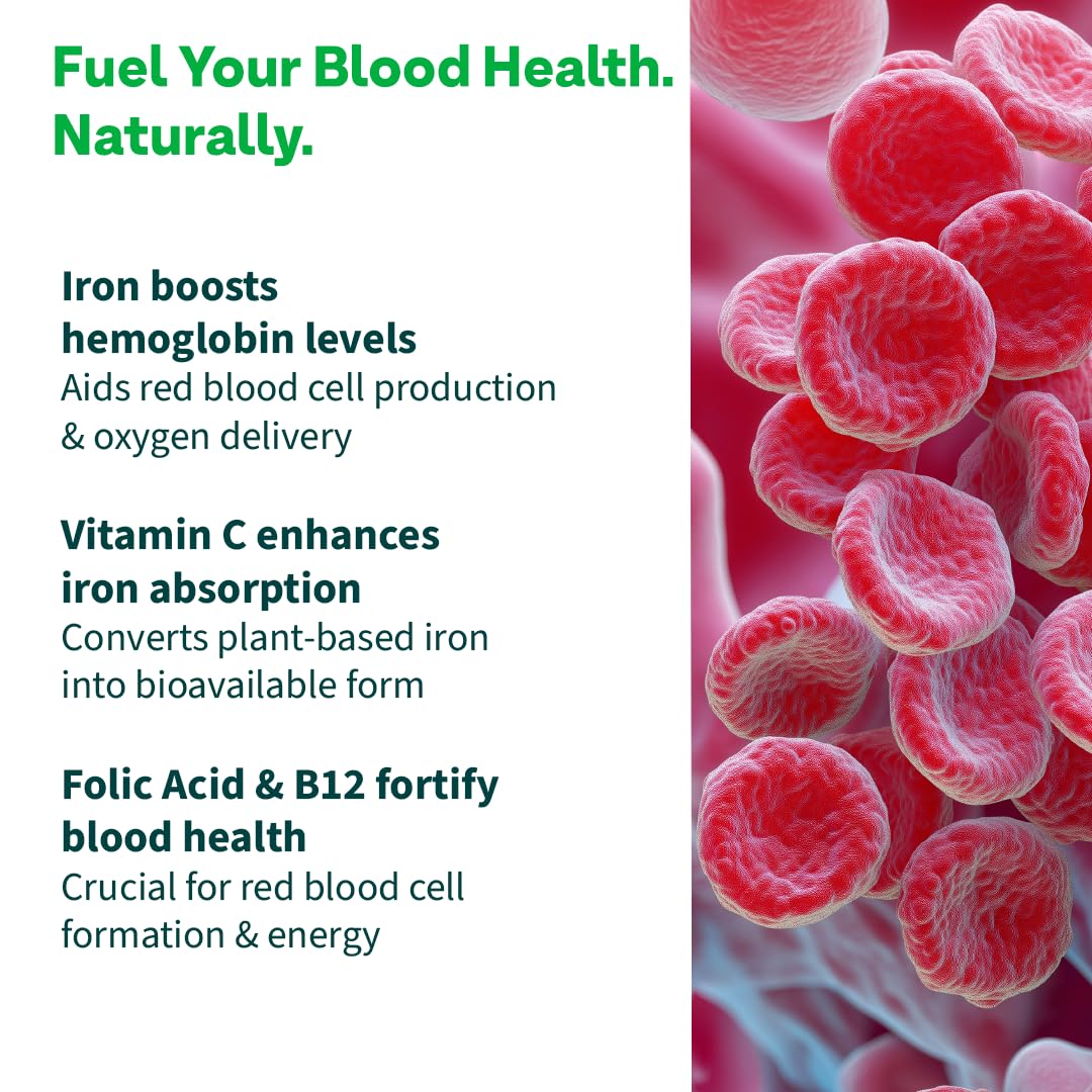 • DNA production and Repair of Red Blood Cells: OZiva Plant Based Bettr.Iron+ is enriched with many other nutrients like Folic acid and Vitamin C which help in the production of RNA and DNA and repair of Red Blood Cells (RBCs) respectively.