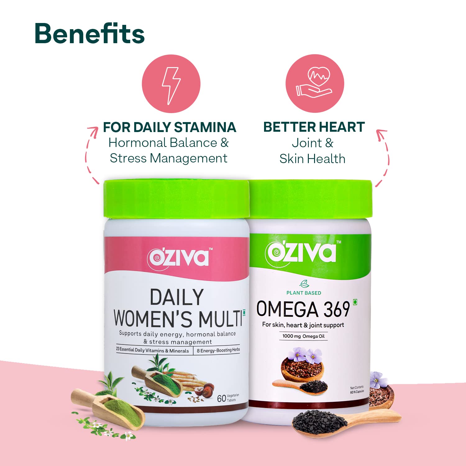 OZiva Daily Womenâs Multi | Multivitamin capsules for Women with Shatavari & Brahmi | Supplements for Hormonal Balance & Stress Management (Wellness combo Pack)