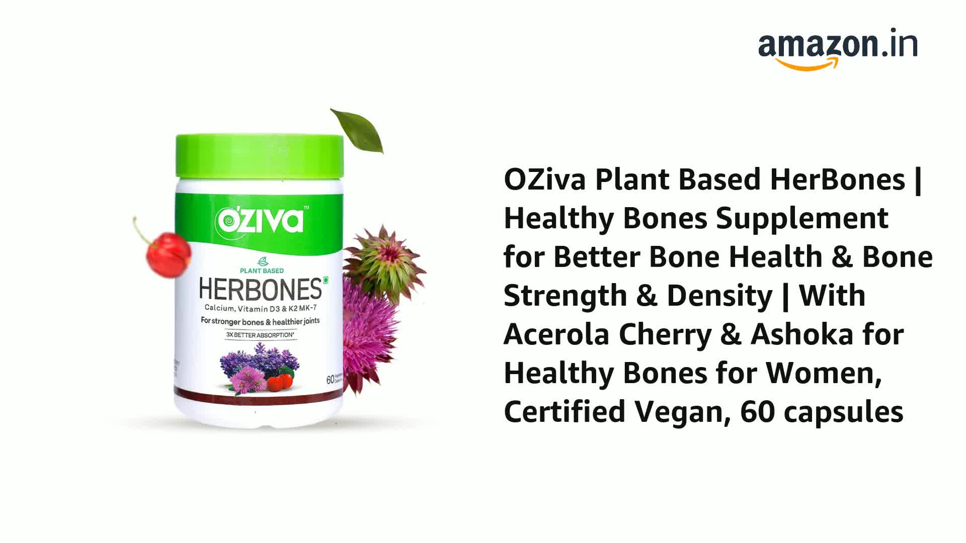 OZiva Plant Based HerBones|Healthy Bones Supplement for Better Bone Health & Bone Strength & Density|With Acerola Cherry & Ashoka for Healthy Bones for Women,Certified Vegan,60 capsules,70 grams