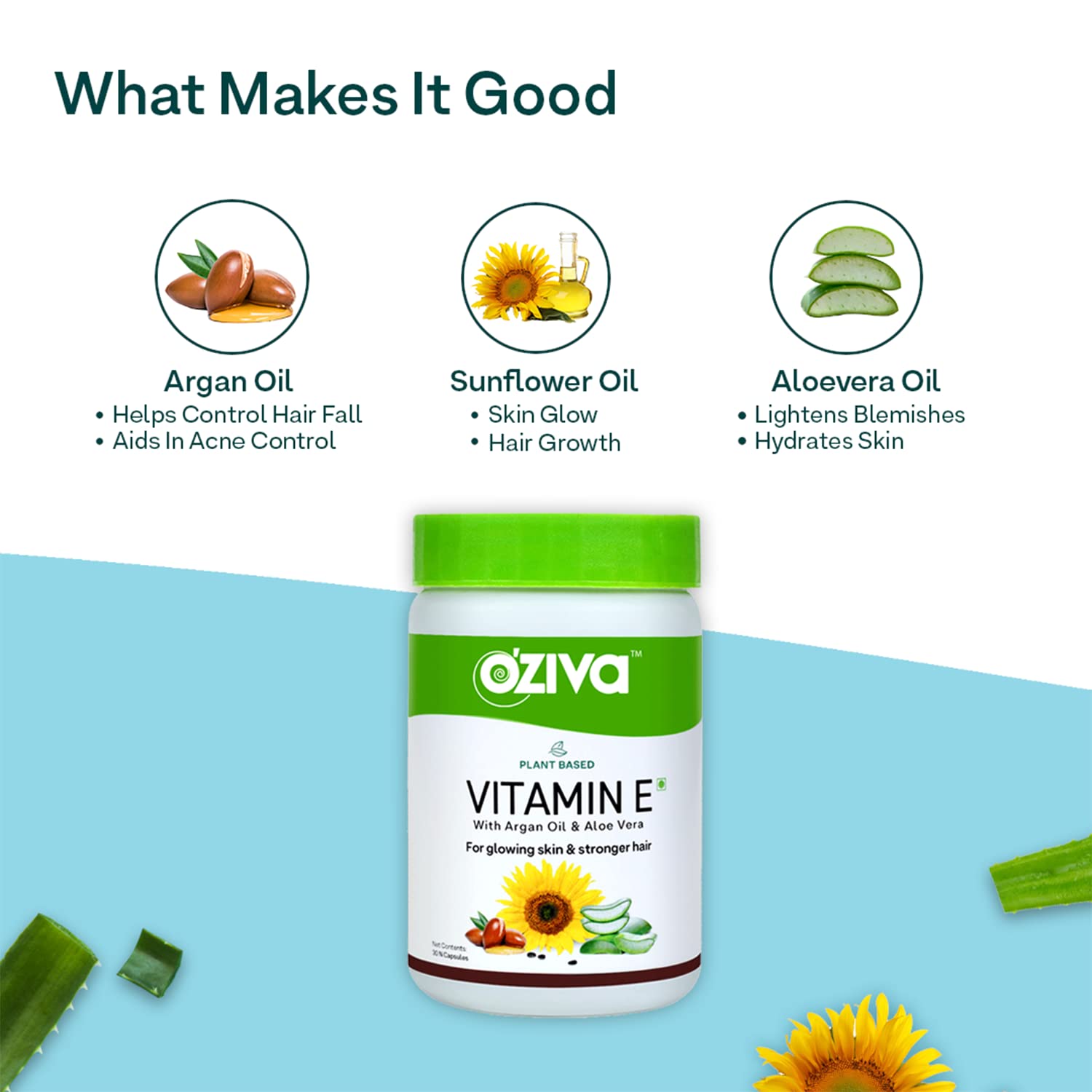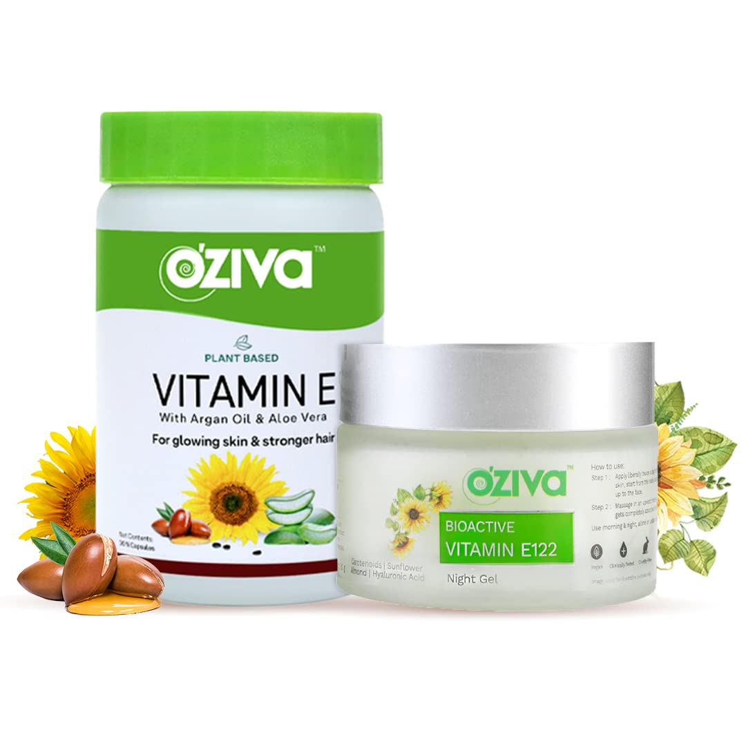 OZiva Plant Based Vitamin E (With Sunflower Aloe Vera & Argan Oils) + OZiva Bioactive Vitamin E122 Night Gel (With Hyaluronic Acid Almond) for Glowing Skin & Wrinkles Reduction | Combo Pack