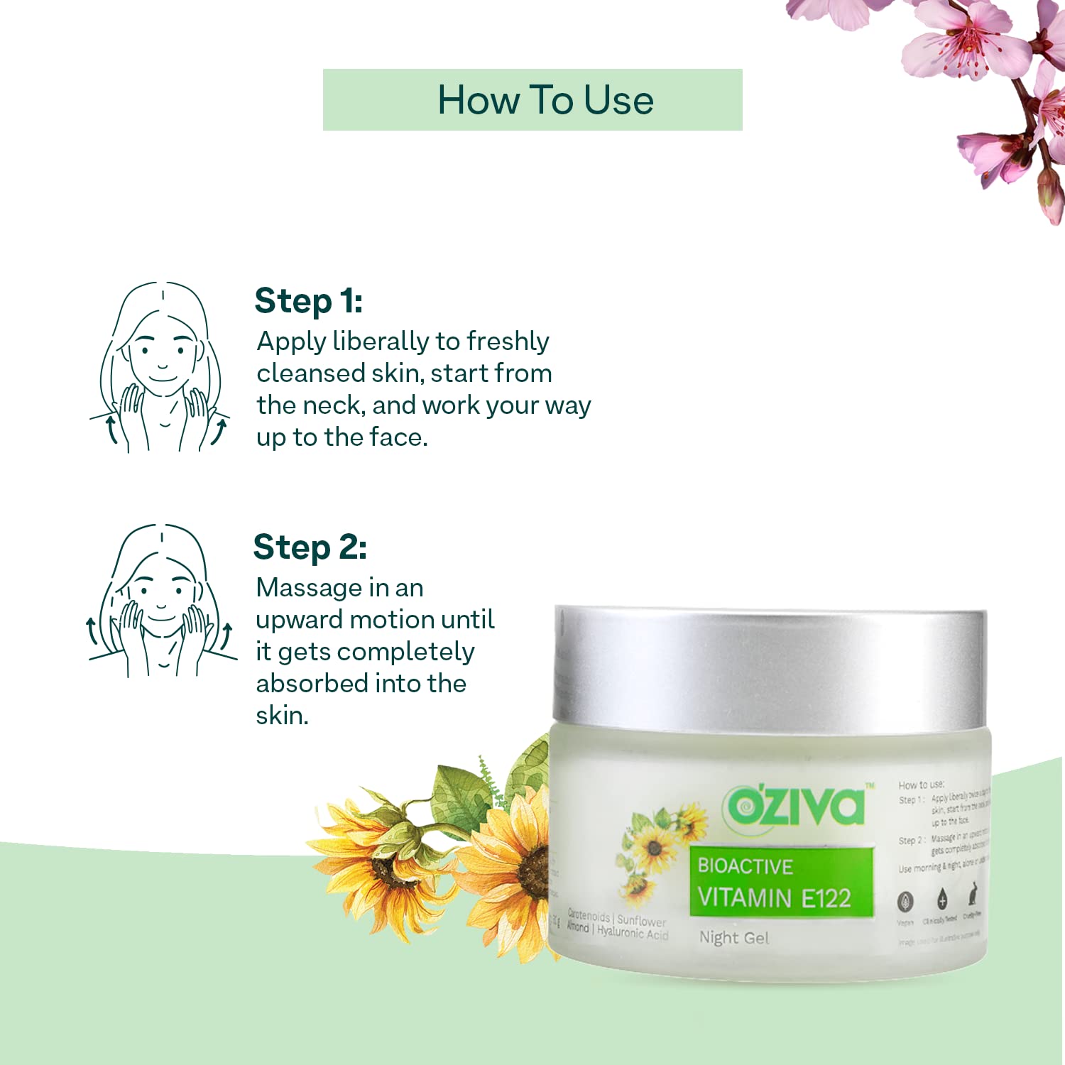 • OZiva Vitamin E122 Night Gel contains pure bioactive Vitamin E which plays an important role in helping enhance skin moisturisation and hydration increase antioxidant capacity give the skin anti-wrinkle properties and prevent drying and peeling. It also h