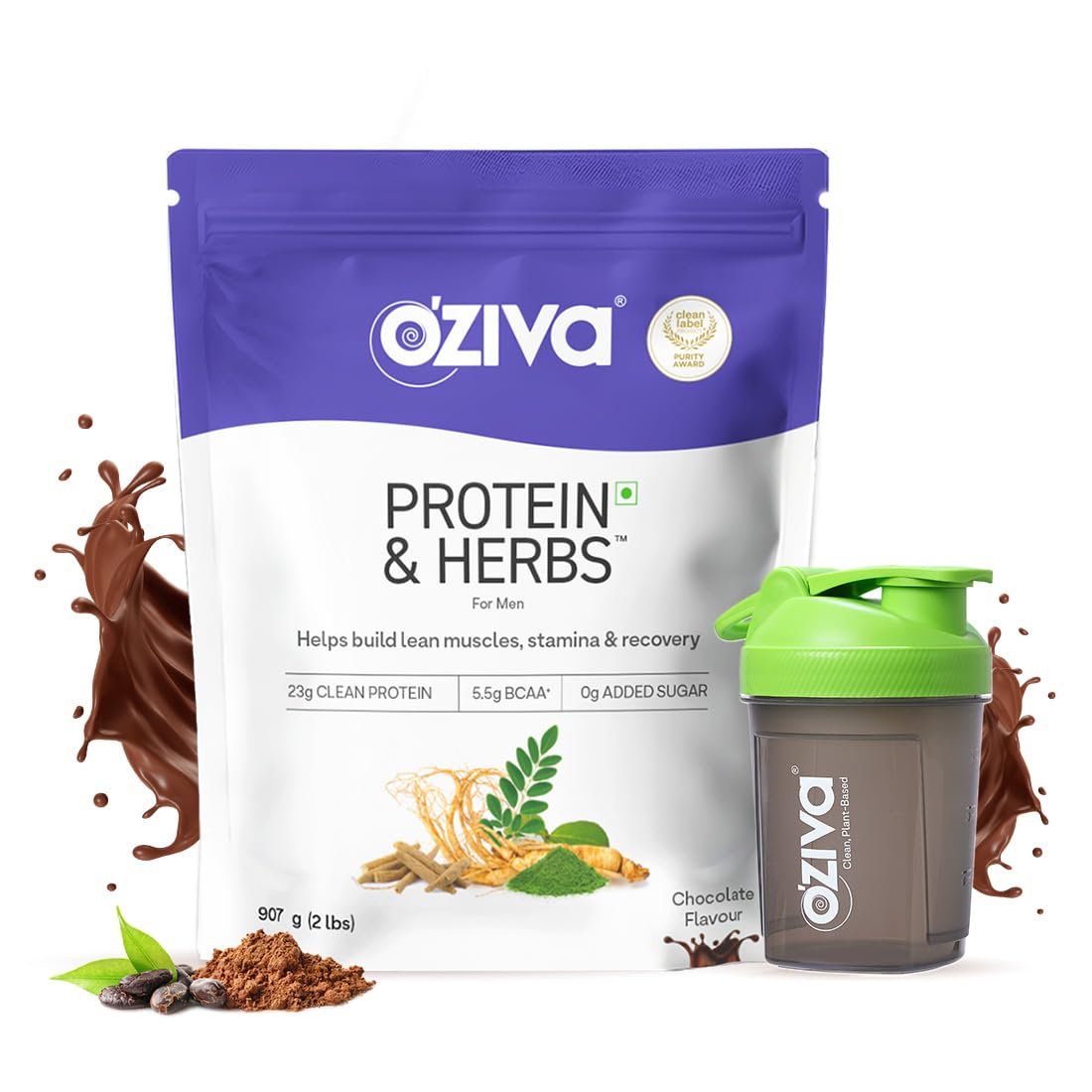 OZiva Protein & Herbs for Men (Chocolate) I Muscle Building, Stamina & Recovery | Clean Protein, Shatavari, Green Tea I No Added Sugar, 2lbs + Shaker