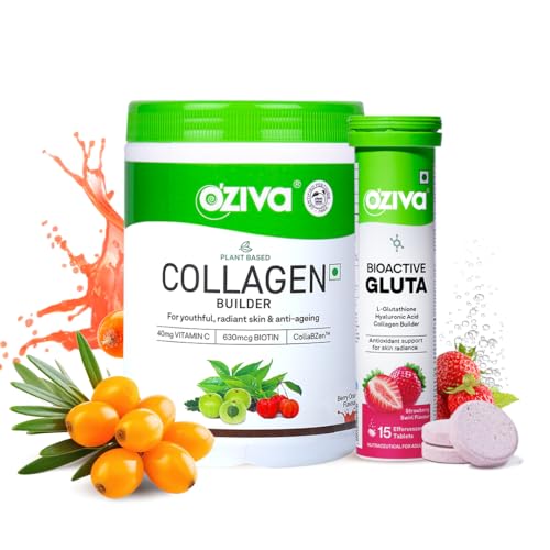 OZiva Vegan Collagen (Berry Orange) with Biotin & Vitamin C For Brighter & Youthful Skin 200g and OZiva Bioactive Glutathione Tablets for Radiant Skin | L-Glutathione, Lycopene | Strawberry